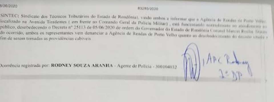 O Sindicato dos Auditores Fiscais de Tributos de Rondônia (Sindafisco) e do Sindicato dos Técnicos Tributários do Estado (Sintec) registraram boletim de ocorrência (Nº 83285/2020) contra a Administração Pública representada pelo Secretário de Finanças de Rondônia, Luis Fernando Pereira da Silva descumprimento do Decreto N° 25.113, de 5 de junho de 2020, de ordem do Governador do Estado de Rondônia, que suspendeu totalmente as atividades e serviços não essenciais na capital e Candeias do Jamari.