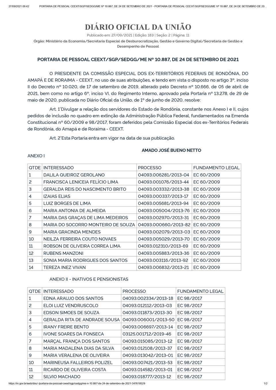 Portaria da Comissão Especial dos ex-Territórios Federais de Rondônia, do Amapá e de Roraima – CEEXT, divulgada no Diário Oficial da União concede transposição para servidores do Estado de Rondônia, inclusive aposentados, com fundamentados na Emenda Constitucional nº 60/2009 e 98/2017. CONFIRA: