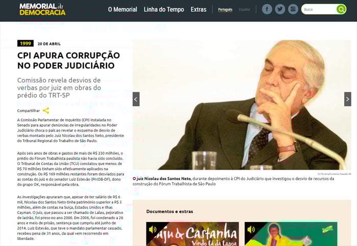 “O relatório da CPI concluiu que o juiz aposentado Nicolau dos Santos Neto, ex-presidente do TRT-SP, praticou atos que indicam improbidade administrativa, enriquecimento ilícito e desvio de dinheiro público em proveito próprio e alheio, durante o período em que foi responsável pela construção do edifício-sede das Juntas de Conciliação e Julgamento do tribunal".