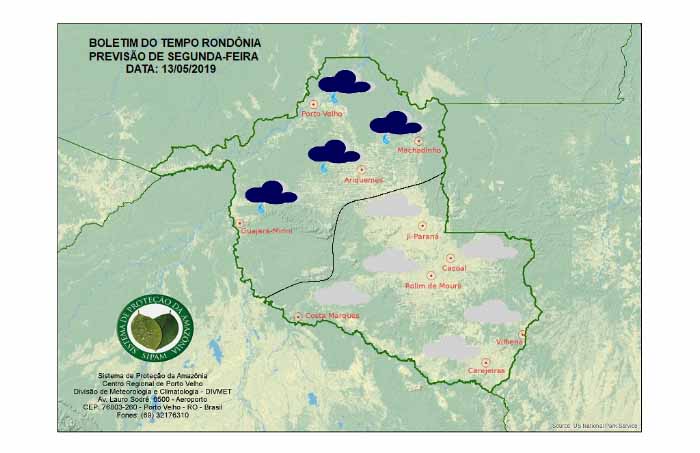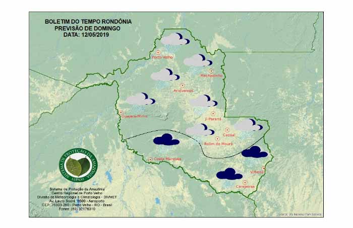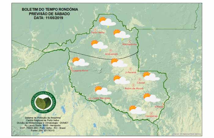 A Divisão de Meteorologia do Sistema de Proteção da Amazônia informa que o fim de semana será de temperaturas amenas e de dias nublados e ventilados em todo o sul da Amazônia. A passagem de um frente fria pelo sul do Brasil provoca um fenômeno já conhecido na região como friagem. A mesma deve atingir o Estado do Mato Grosso no inicio da noite, chegando ao cone sul Rondoniense na madrugada de sábado para domingo. Porém a friagem causa instabilidade entre a tarde e a noite no norte do Estado, onde podem ocorrer pancadas de chuvas e trovoadas de forma isolada. O tempo deverá variar de claro a parcialmente nublado neste sábado.