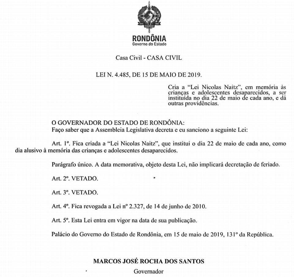 Porto Velho, RO – O governador de Rondônia Coronel Marcos Rocha, do PSL, sancionou a Lei Nicolas Naitz, criada em prol da memória de crianças e adolescentes desaparecidos no estado.
