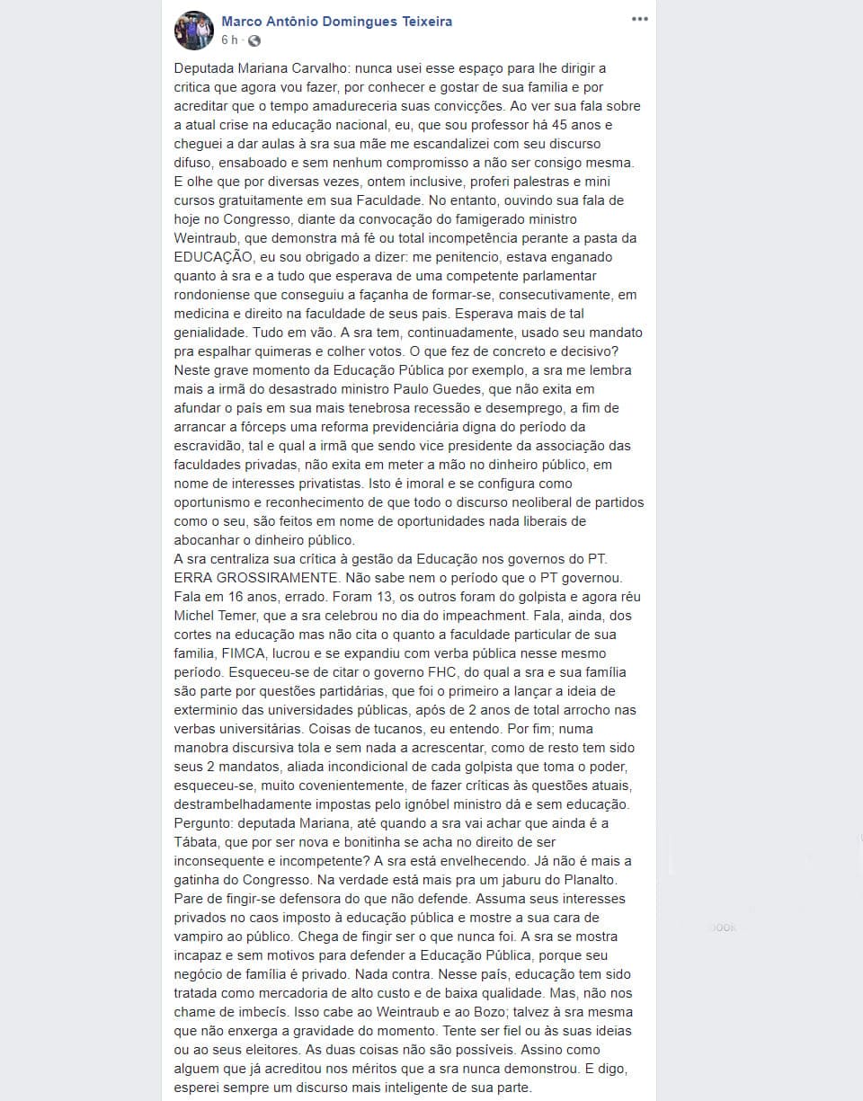 “Pergunto: deputada Mariana, até quando a sra vai achar que ainda é a Tábata, que por ser nova e bonitinha se acha no direito de ser inconsequente e incompetente? A sra está envelhecendo. Já não é mais a gatinha do Congresso. Na verdade, está mais pra um jaburu do Planalto. Pare de fingir-se defensora do que não defende. Assuma seus interesses privados no caos imposto à educação pública e mostre a sua cara de vampiro ao público”.