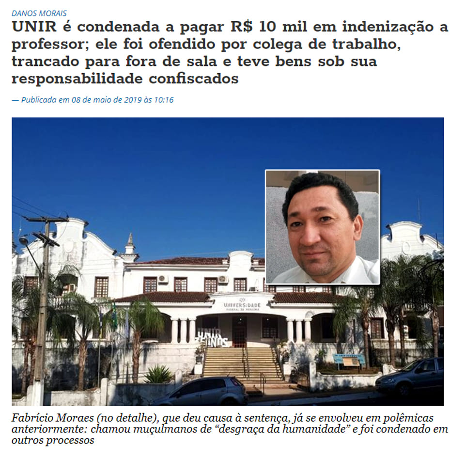 Por conta do comportamento de Fabrício de Almeida, por exemplo, a UNIR chegou a ser condenada pela Justiça Federal de Rondônia a pagar R$ 10 mil em indenização ao professor Walace Soares de Oliveira, ex-servidor da Universidade.