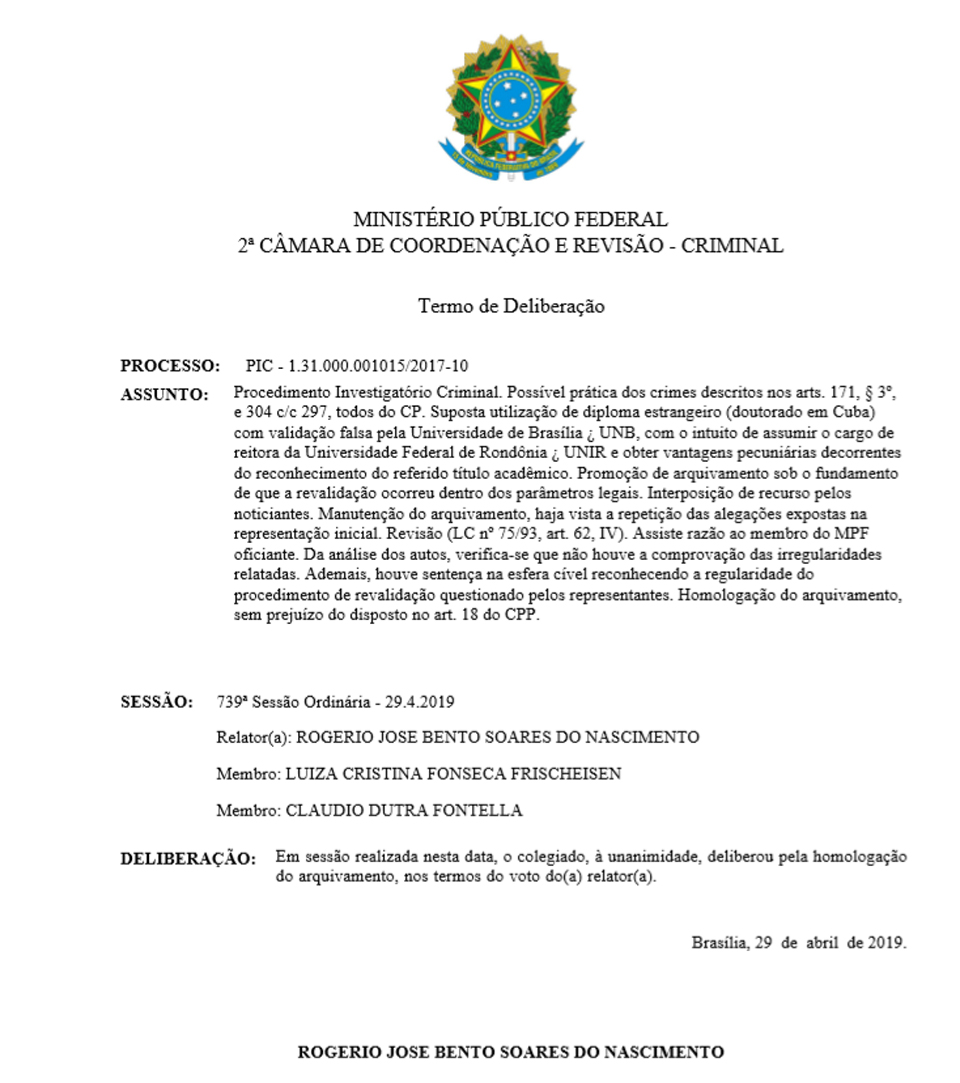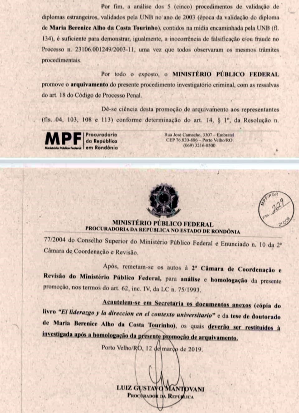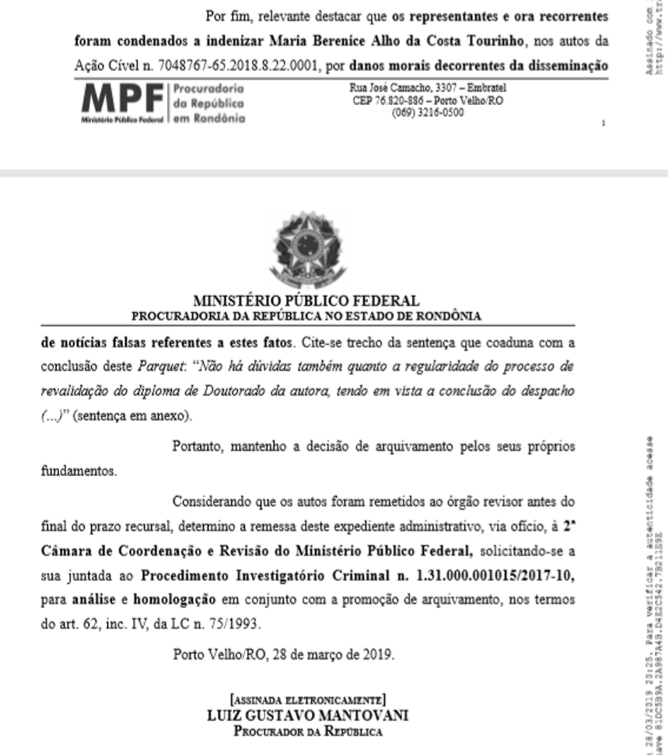 “Por fim, relevante destacar que os representantes e ora recorrentes foram condenados a indenizar Maria Berenice Alho da Costa Tourinho, nos autos da Ação Cível n. 7048767-65.2018.8.22.0001, por danos morais decorrentes da disseminação de notícias falsas referentes a estes fatos. Cite-se trecho da sentença que coaduna com a conclusão deste Parquet: “Não há dúvidas também quanto a regularidade do processo de revalidação do diploma de Doutorado da autora, tendo em vista a conclusão do despacho (…)” (sentença em anexo). Portanto, mantenho a decisão de arquivamento pelos seus próprios fundamentos”.