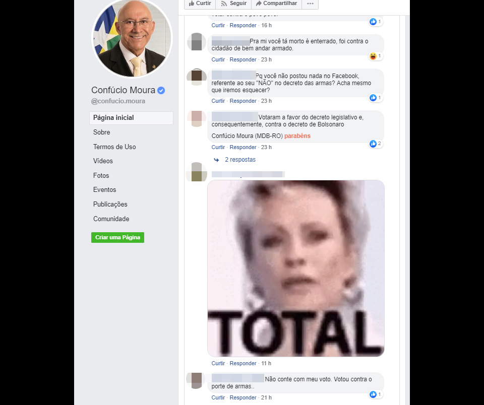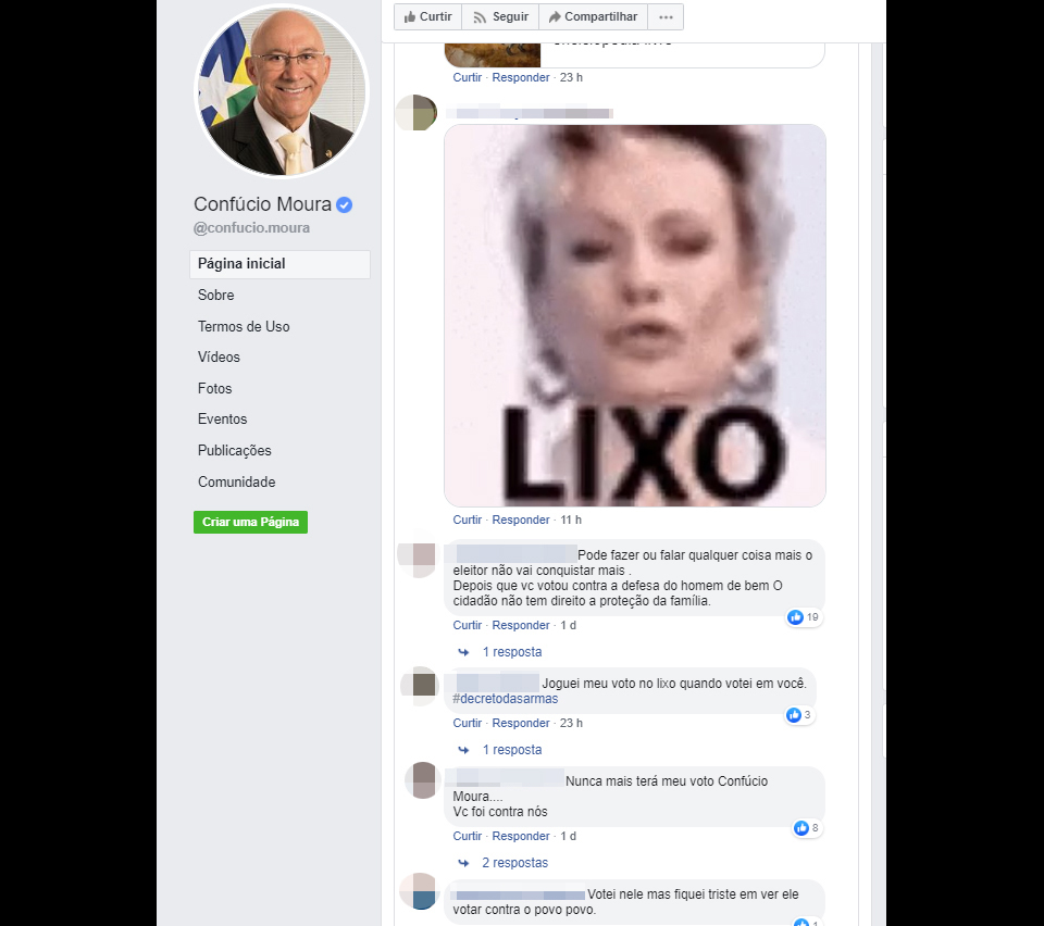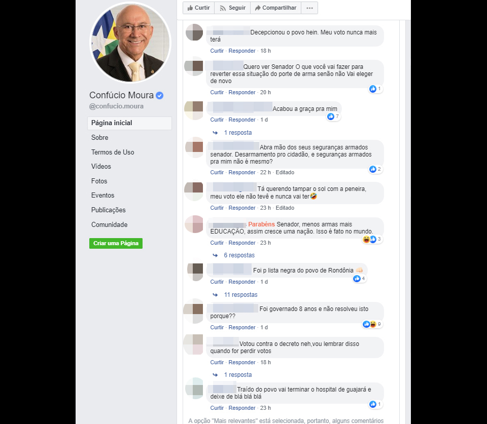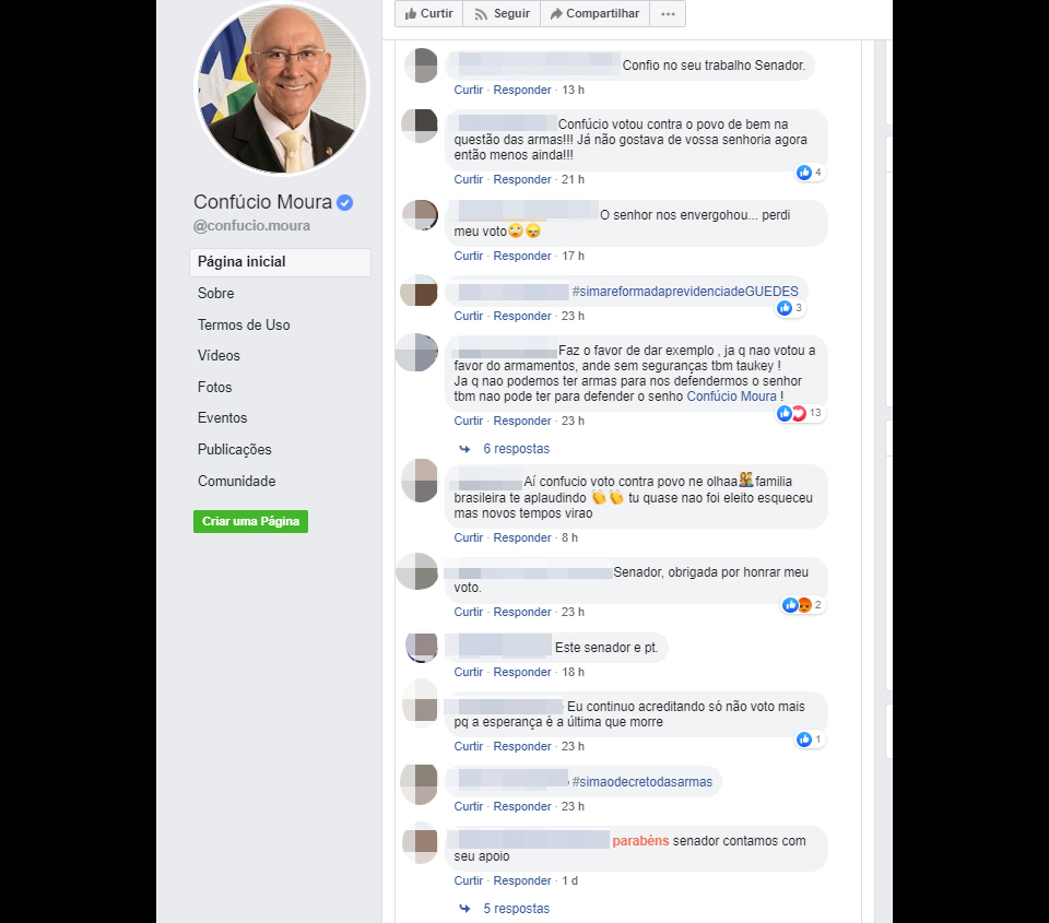 Em sua página oficial no Facebook, o emedebista teve de absorver o fel da vida pública por se posicionar de maneira contrária ao decreto de armas editado pelo presidente Jair Bolsonaro (PSL).