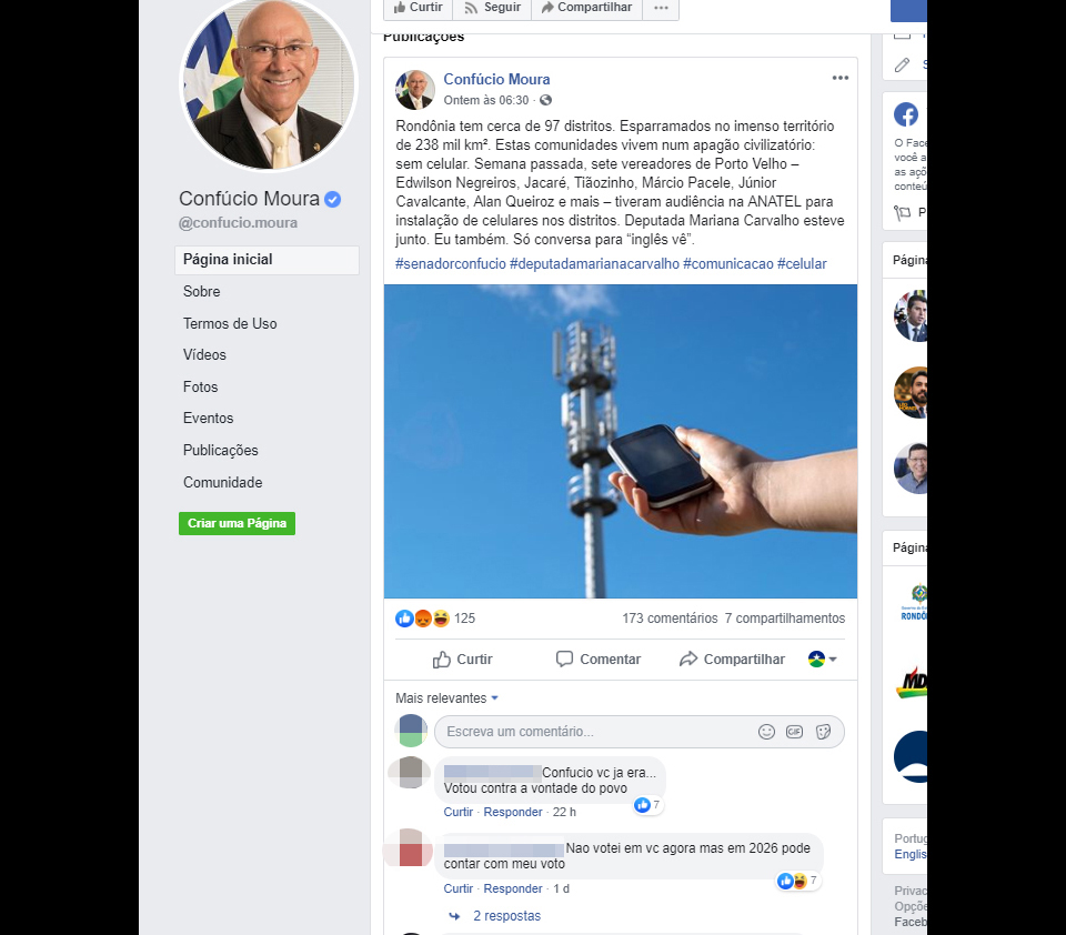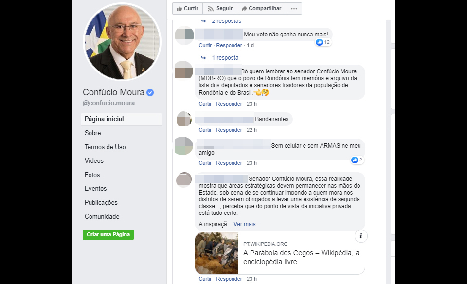 Porto Velho, RO – Pela primeira vez em muito tempo, o senador Confúcio Moura, do MDB, ex-governador de Rondônia, é duramente criticado pela imensa maioria em suas redes sociais.