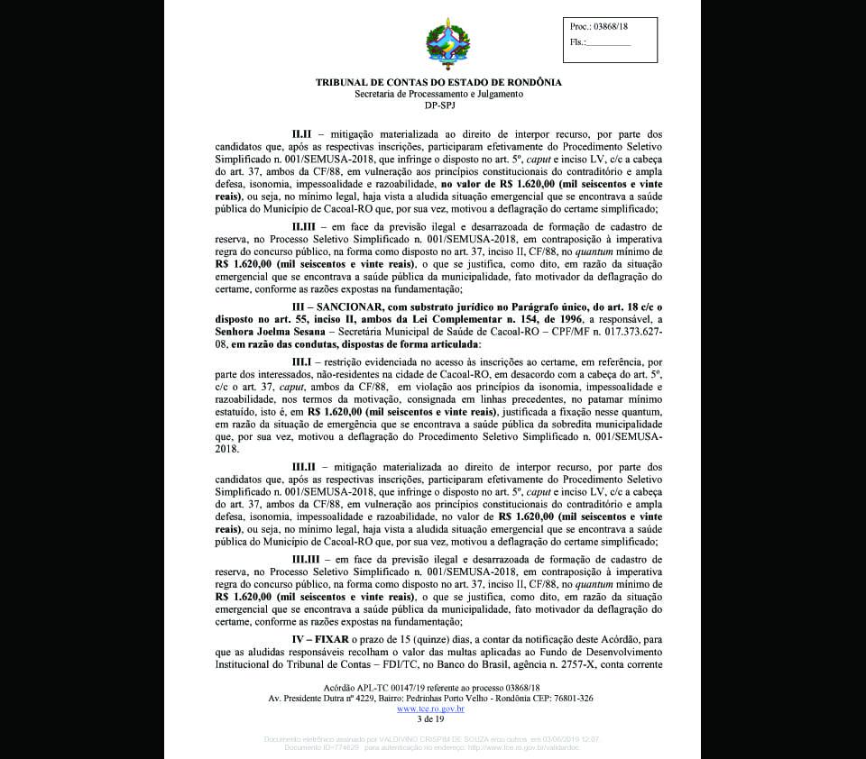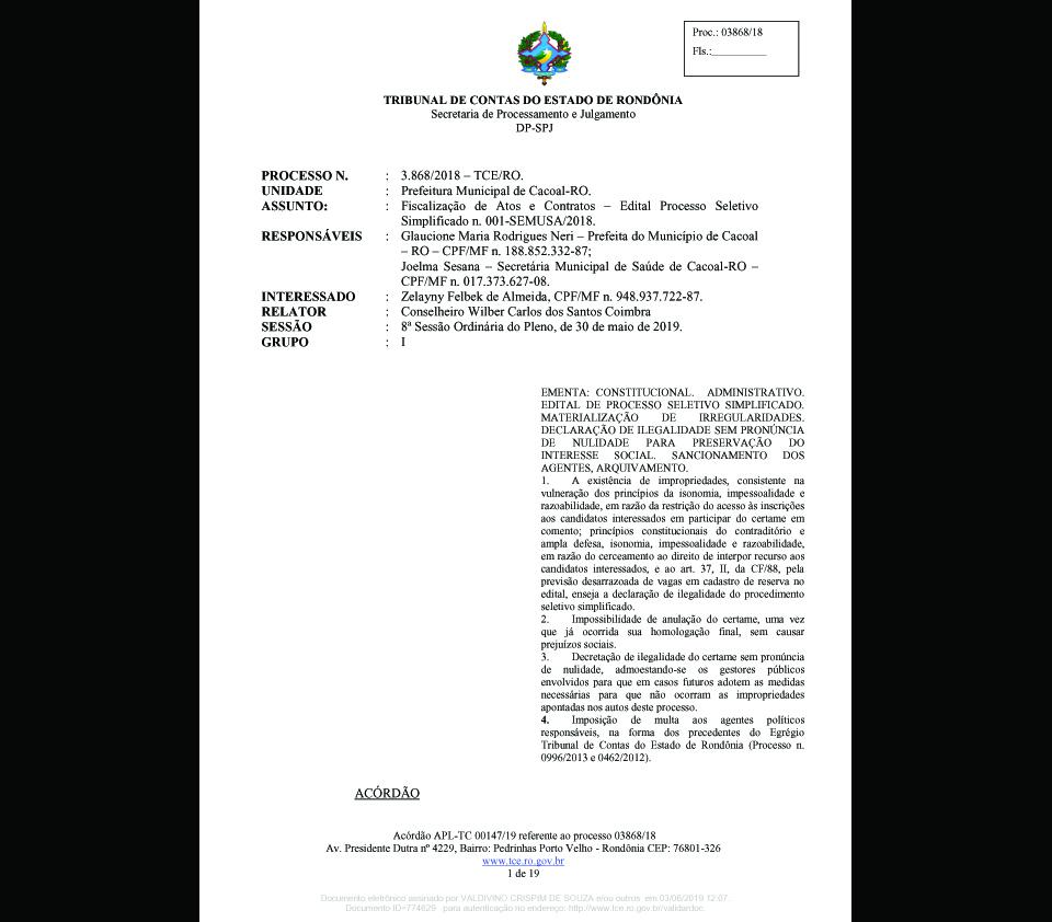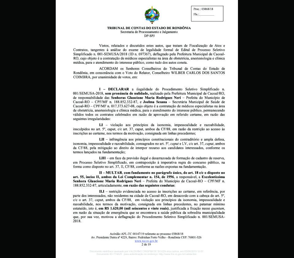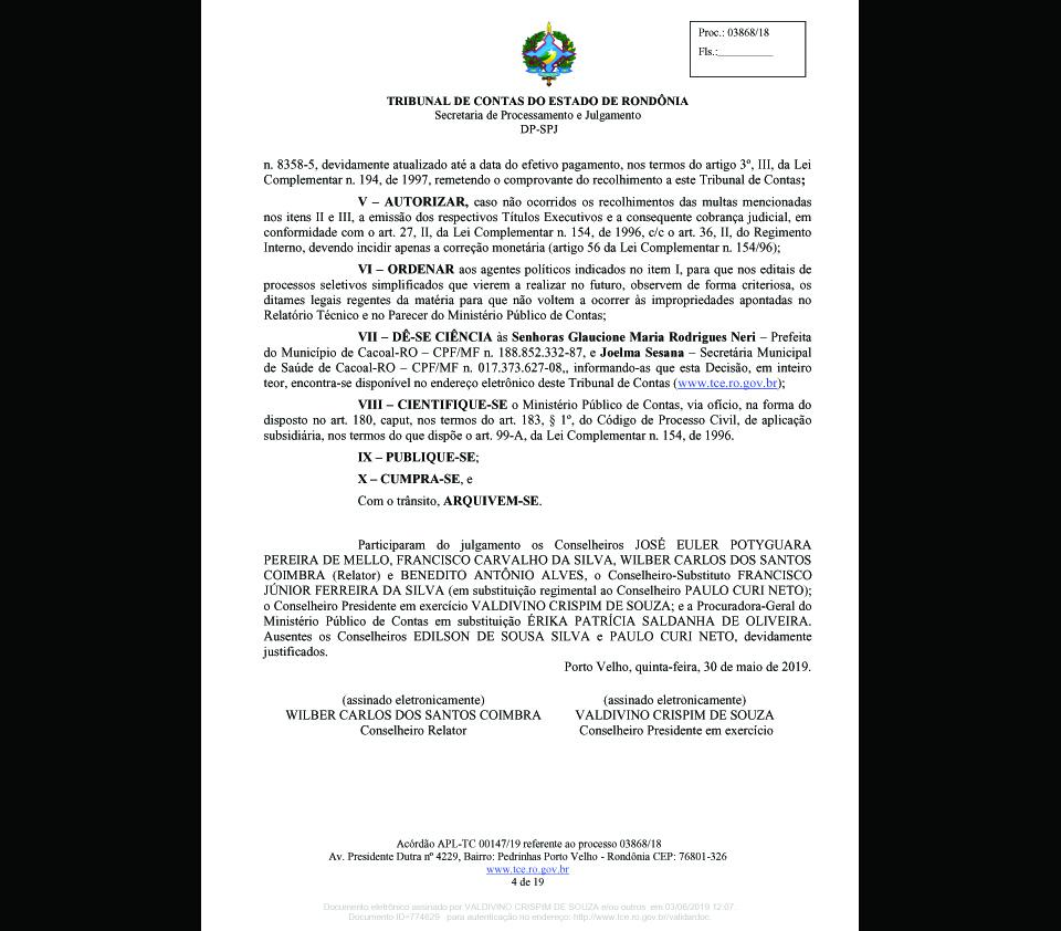 CONFIRA OS TERMOS DO ACÓRDÃO E AS SANÇÕES APLICADAS A GLAUCIONE RODRIGUES E JOELMA SESANA