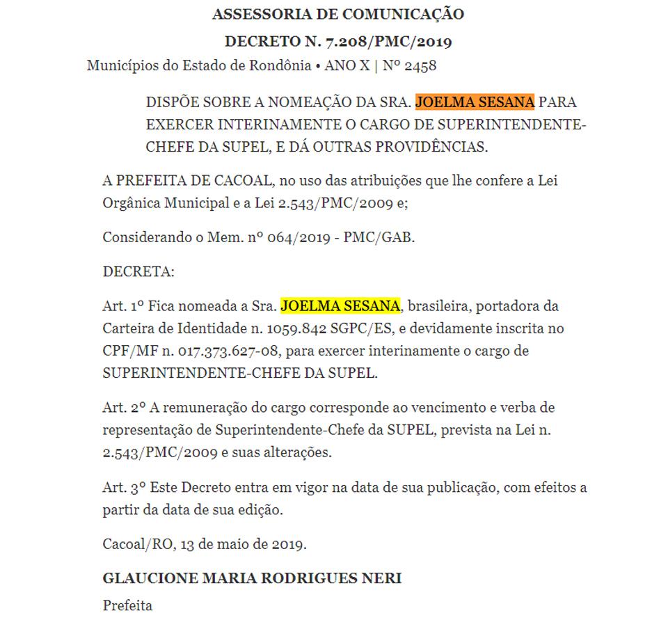 Joelma Sesana foi secretária de Saúde, de acordo com o Portal Transparência de Cacoal, de junho de 2017 a março deste ano