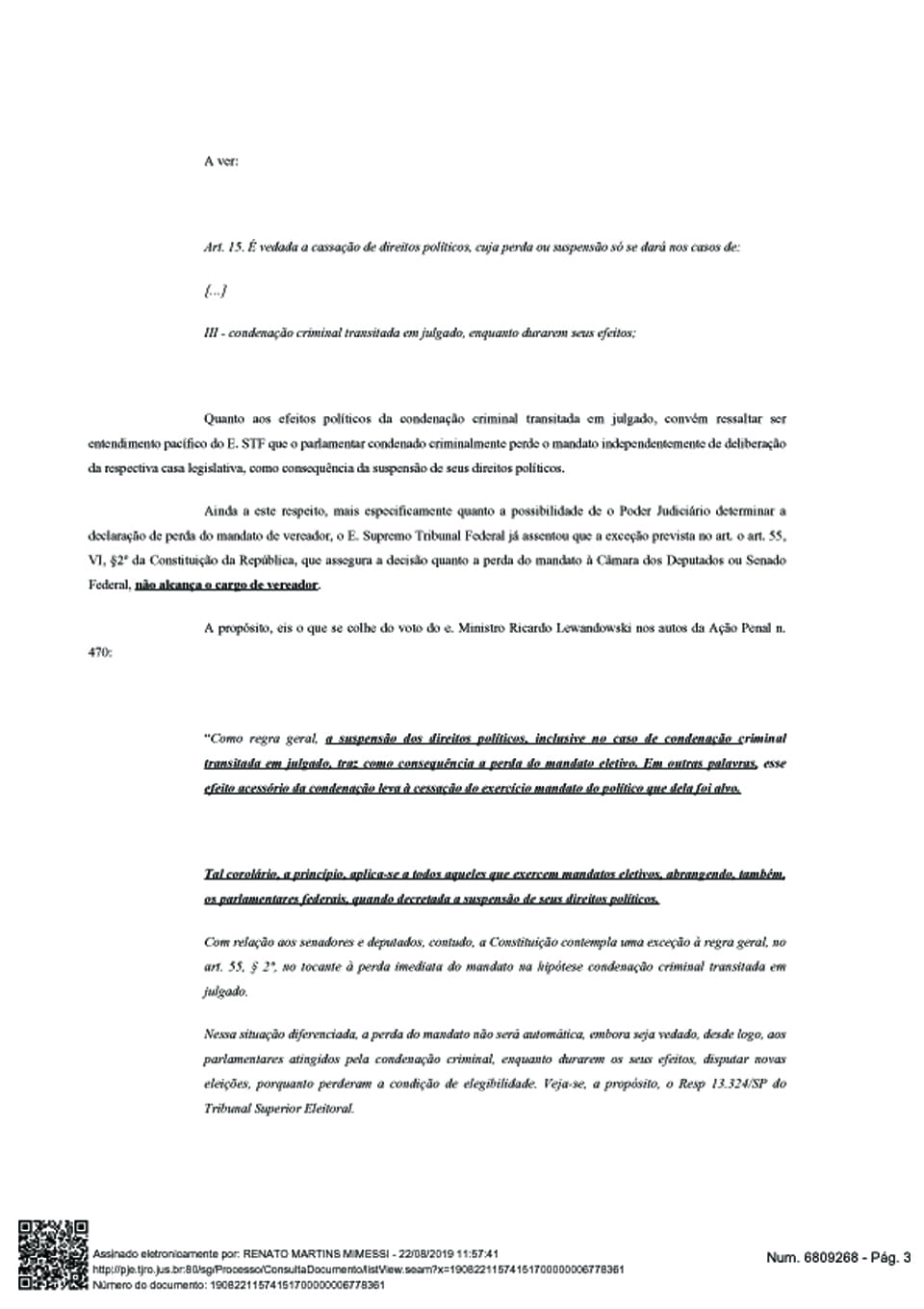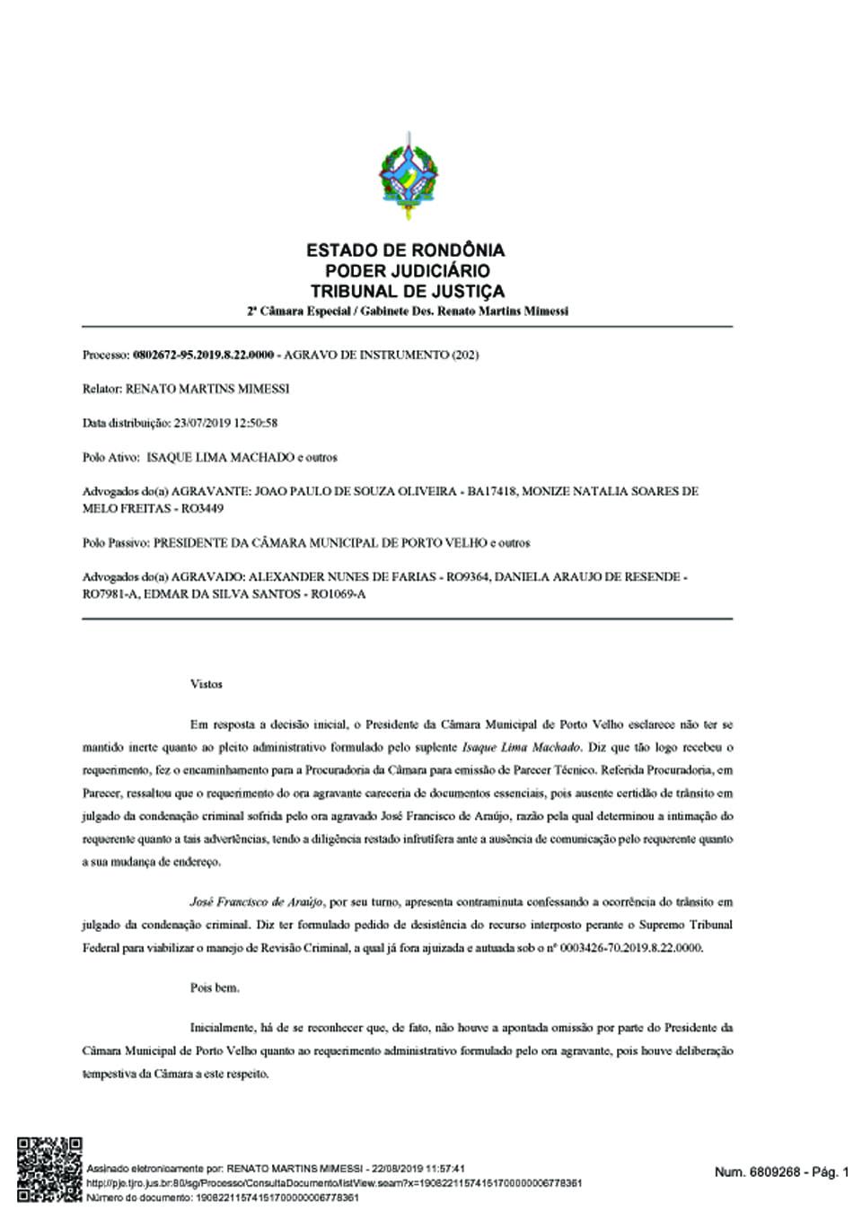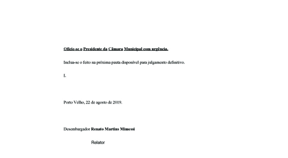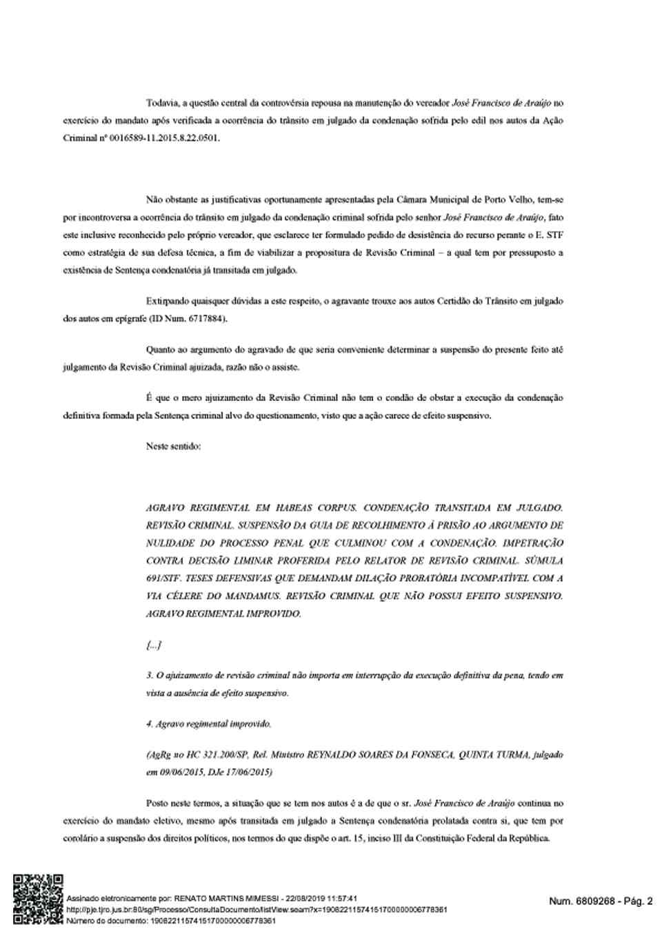 “Sendo precisamente esta a situação noticiada nos autos, tem-se por evidenciada a urgência de se determinar à Câmara Municipal de Porto Velho que declare a perda do mandato de vereador ainda ocupado pelo ora agravado [Zequinha], sob pena de se vulnerar a condução dos trabalhos desenvolvidos pelo Legislativo Municipal, diante da presença de integrante que não reúne condições legais de permanecer no exercício do cargo de tão elevada importância à sociedade local, além de violar flagrantemente direito líquido e certo do respectivo suplente assumir imediatamente o exercício do mandato do cargo”.