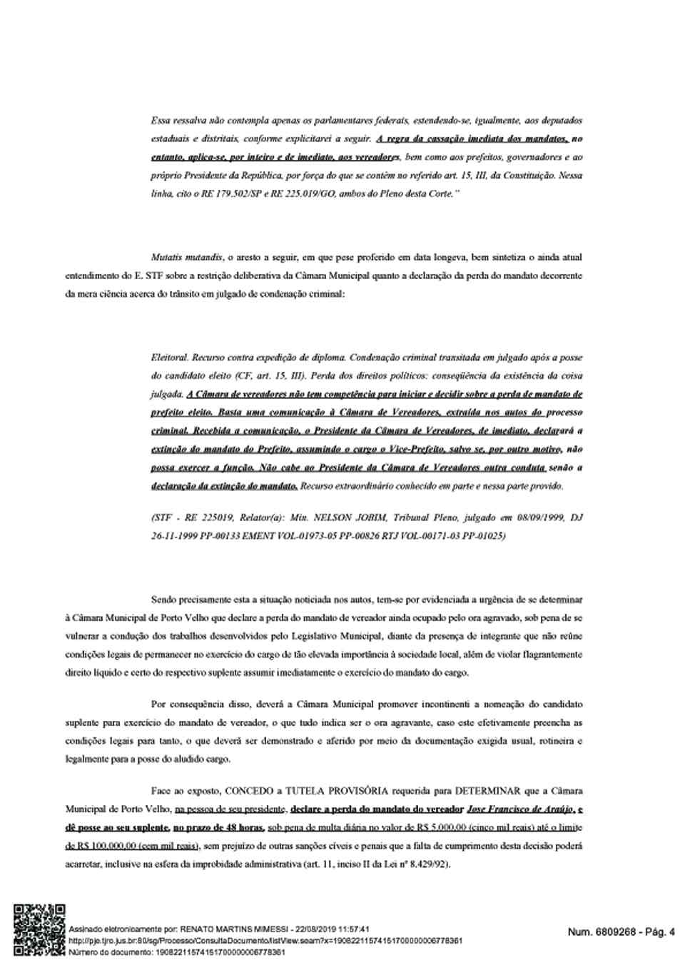 “Face ao exposto, CONCEDO a TUTELA PROVISÓRIA requerida para DETERMINAR que a Câmara Municipal de Porto Velho, , na pessoa de seu presidente declare a perda do mandato do vereador Jose Francisco de Araújo, e dê posse ao seu suplente, no prazo de 48 horas, sob pena de multa diária no valor de R$ 5.000,00 (cinco mil reais) até o limite de R$ 100.000,00 (cem mil reais), sem prejuízo de outras sanções cíveis e penais que a falta de cumprimento desta decisão poderá acarretar, inclusive na esfera da improbidade administrativa (art. 11, inciso II da Lei nº 8.429/92).
