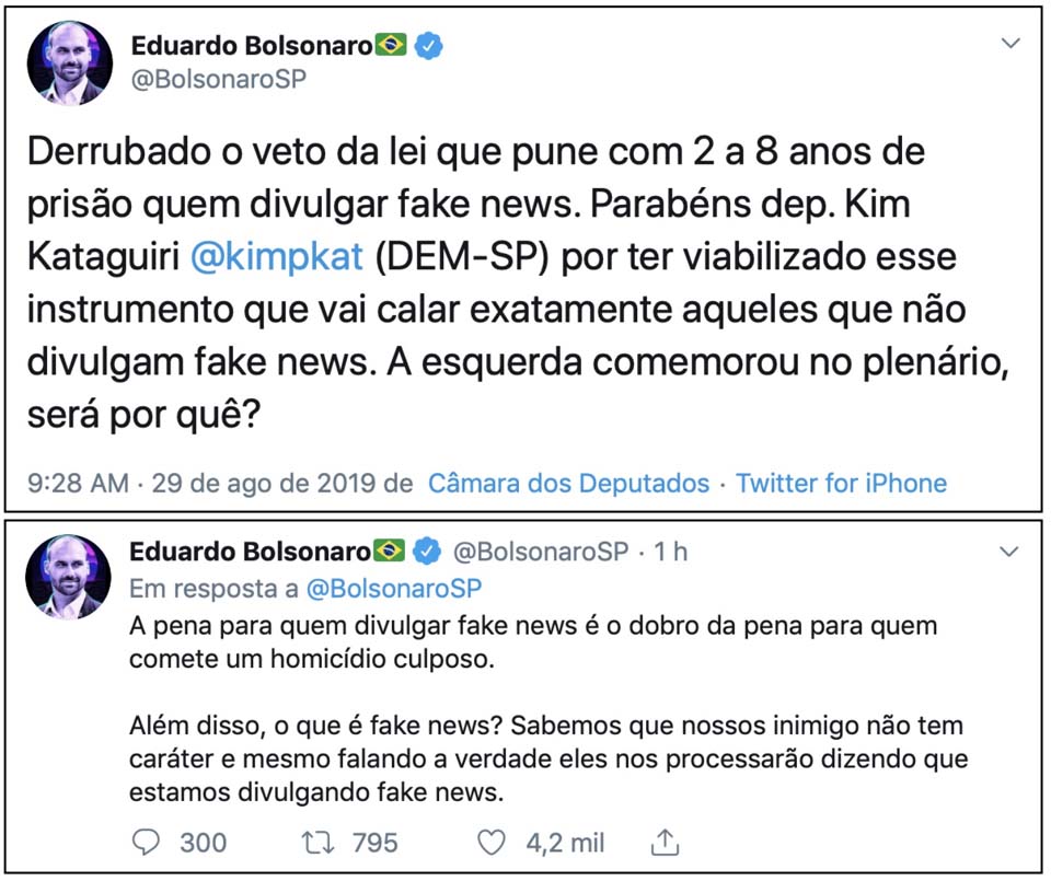 “Parabéns dep. Kim Kataguiri (DEM-SP) por ter viabilizado esse instrumento que vai calar exatamente aqueles que não divulgam fake news”, escreveu Eduardo. “Além disso, o que é fake news?”, questionou.