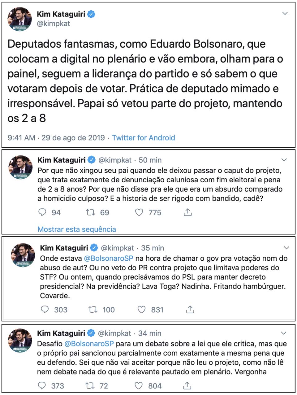 “Deputados fantasmas, como Eduardo Bolsonaro, que colocam a digital no plenário e vão embora, olham para o painel, seguem a liderança do partido e só sabem o que votaram depois de votar”, escreveu Kataguiri em seu perfil no Twitter.