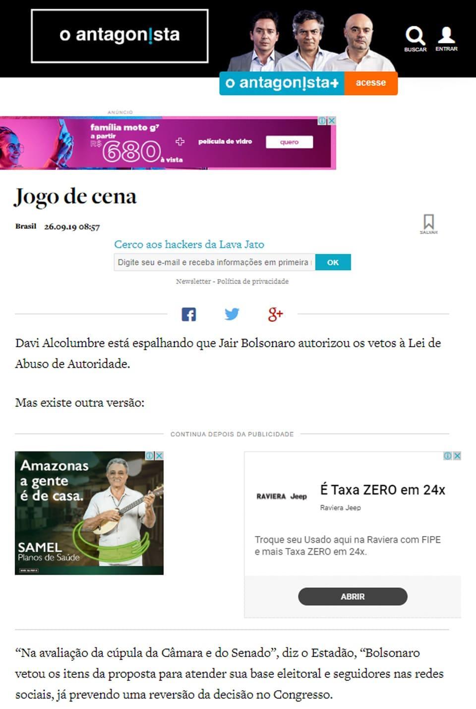 O site de notícias ‘O Antagonista’ destacou em duas notas que os vetos impostos por Bolsonaro não passam de jogo de cena. O presidente teria atendido às reivindicações de sua base eleitoral e seguidores das redes sociais já antevendo a reversão do freio legal no Congresso Nacional.