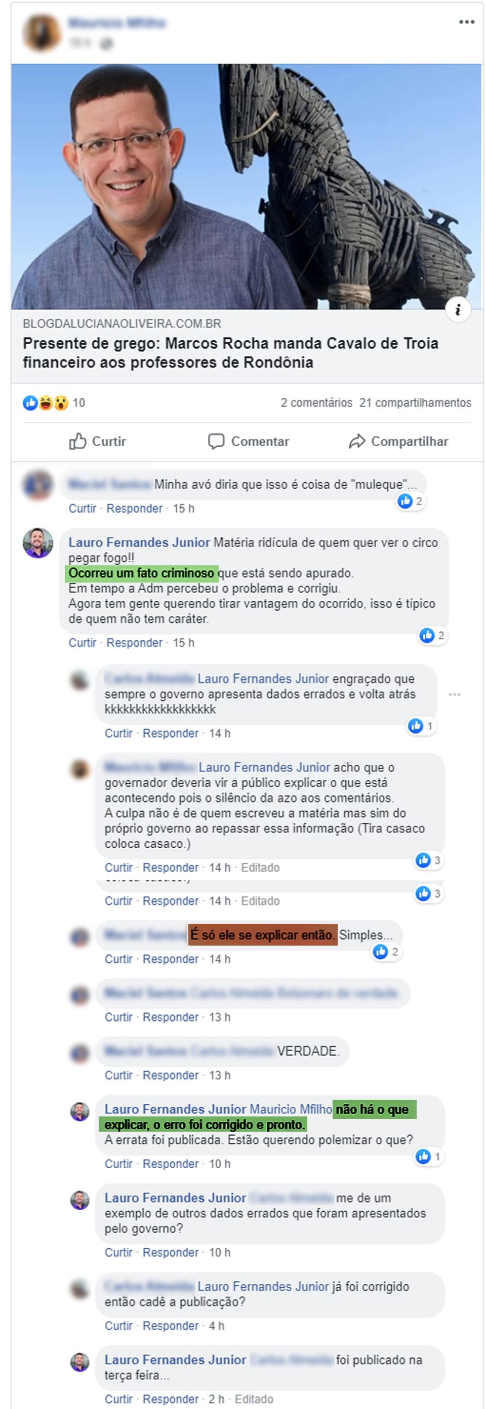 Porto Velho, RO – Embora tenha usado seu perfil particular no Facebook para comentar artigo de autoria do jornalista Vinicius Canova, veiculado originalmente pelo jornal eletrônico Rondônia Dinâmica e reproduzido na íntegra através do Blog da Luciana Oliveira, Lauro Fernandes da Silva Júnior, assessor técnico da gestão Marcos Rocha (PSL), foi o primeiro comissionado próximo ao atual governador a revelar dado inédito até então a respeito do episódio já conhecido como a patacoada das tabelas da Educação.