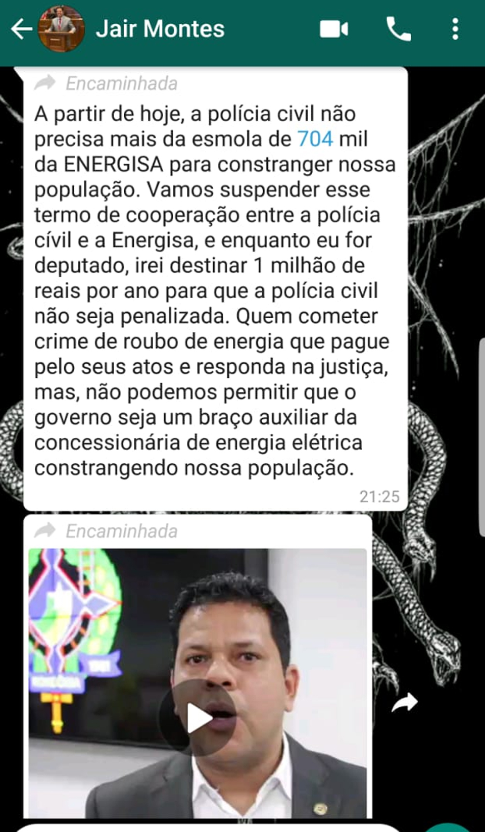 Confira o vídeo abaixo distribuído junto com a mensagem disparada pelo deputado aos seus contatos no WhatsApp: