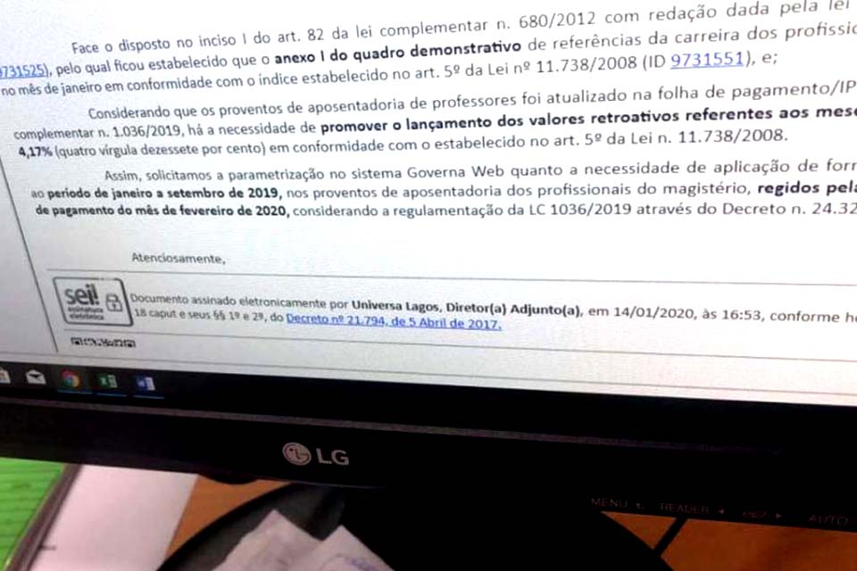 Em resposta, a Diretora do Iperon alegou que o órgão não havia condições de efetuar o pagamento do retroativo do Piso em janeiro, mas que possui ordem de pagamento, conforme anexo abaixo, para quitação do retroativo correspondente aos meses de janeiro até setembro de 2019, no pagamento de fevereiro de 2020. Lembrando que o Piso do Magistério de 2019 teve reajuste de 4,17%.