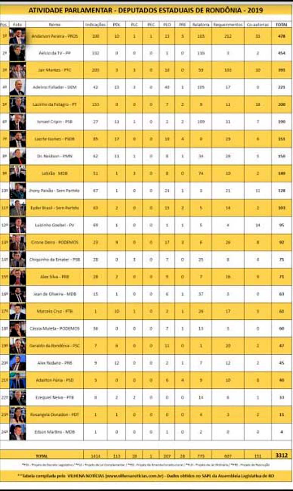 A pesquisa buscou junto ao site da Assembleia Legislativa de Rondônia dados das atividades parlamentares dos 24 deputados estaduais em 2019. O ranking mostra uma diferença muito dilatada entre os deputados que estão no topo da lista para os que estão no fim dela.