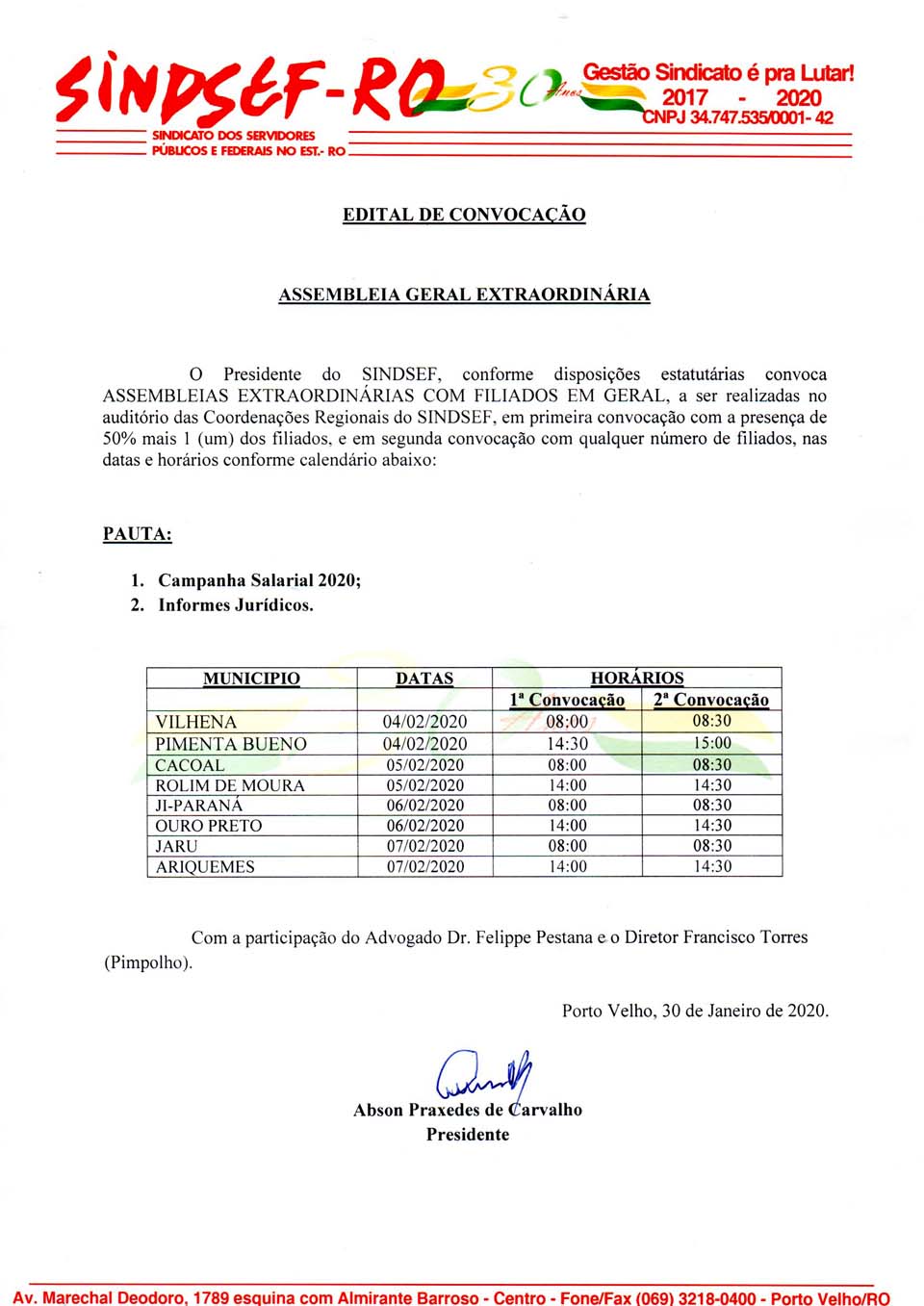 Assembleias extraordinárias a ser realizadas no auditório das coordenações regionais