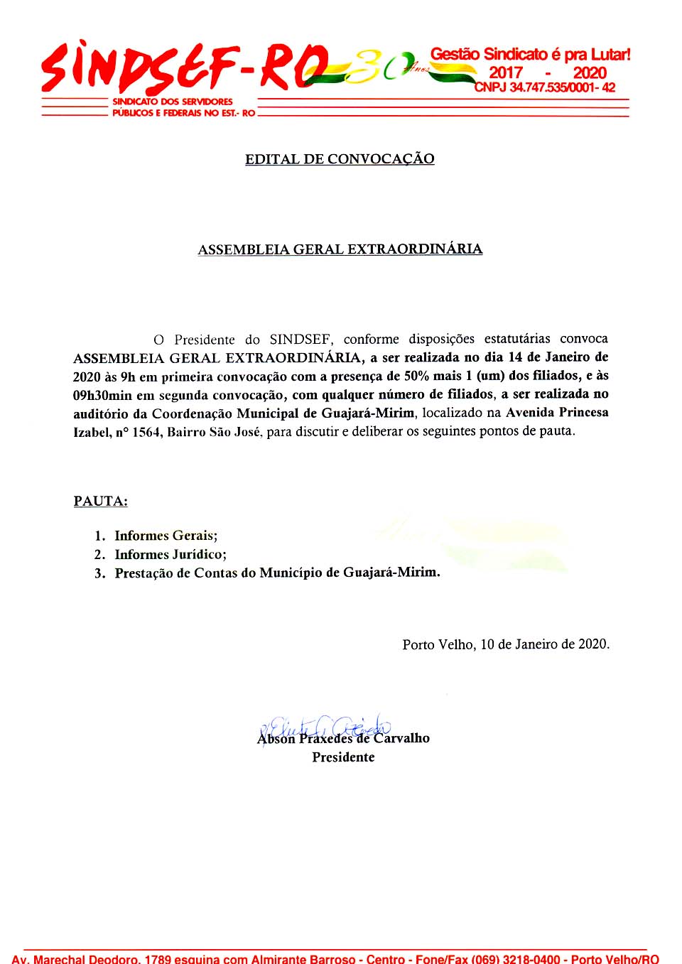 O presidente do Sindicato dos Servidores Públicos e Federais no Estado de Rondônia - Sindsef-RO, conforme disposições estatutárias, convoca para assembleia geral, que ocorrerá no próximo dia 14, as 9 horas, seus filiados. A assembleia será realizada no auditório da Coordenação Municipal de Guajará-Mirim. Confira Edital de Convocação e pauta a ser discutida, abaixo: