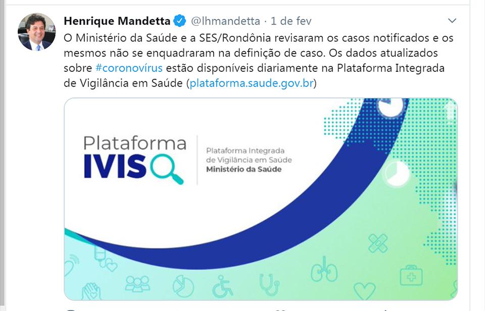 Porto Velho, RO — O ministro da Saúde Luiz Henrique Mandetta usou seu perfil no Twitter a fim de informar à sociedadee brasileira que os casos suspeitos de Coronavírus em Rondônia "não se enquadram" no perfil sintomático, descartando a hipótese.