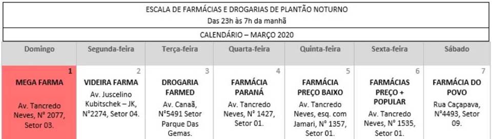 A Prefeitura Municipal de Ariquemes, por meio da Gerência de Vigilância Sanitária, da Secretaria Municipal de Saúde (SEMSAU), divulga oficialmente a lista de plantão das Farmácias e Drogarias da cidade que deverão prestar plantões de atendimento entre as 23:00 e 07:00 da manhã, durante o mês de março, de 2020, em consonância com a Lei Municipal nº. 2.348/2019.
