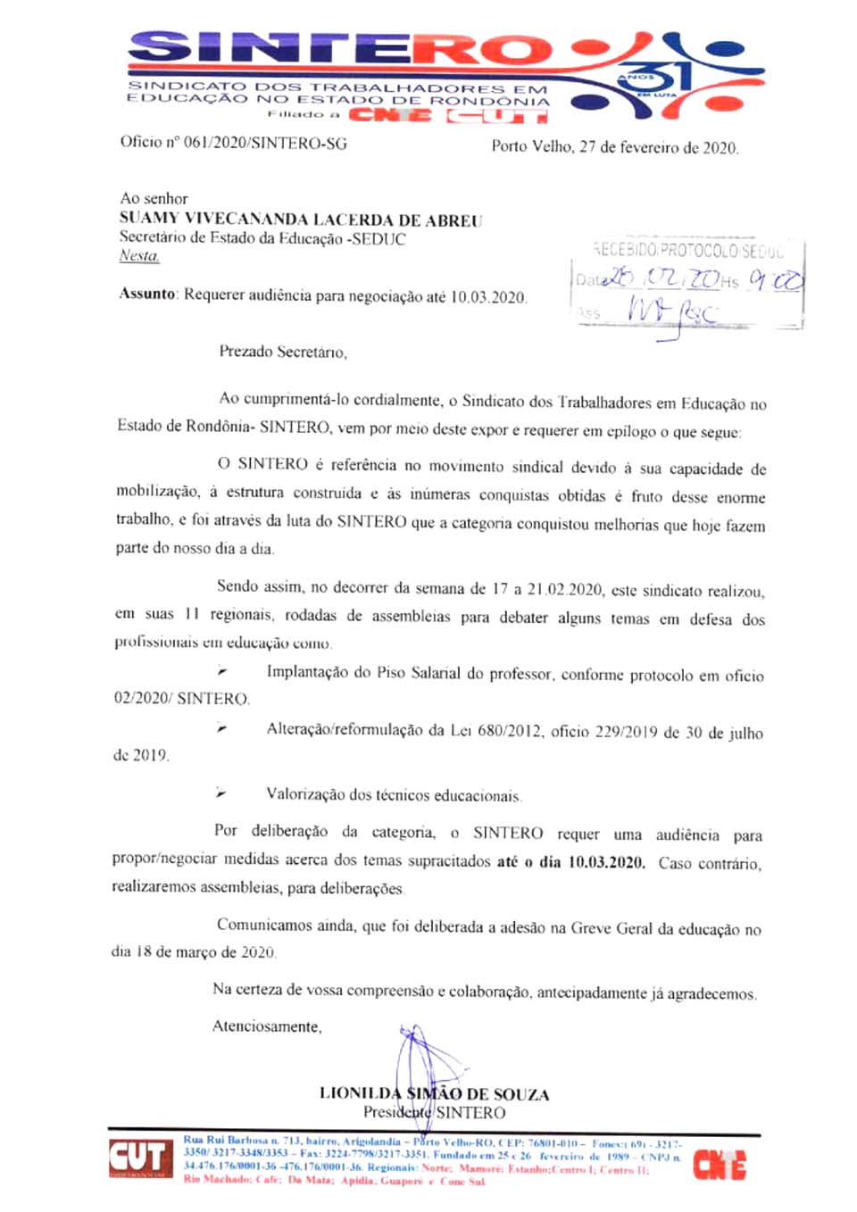 Outro ponto questionado pela categoria foi o andamento das negociações com o Governo, principalmente sobre o item que trata da atualização do Piso Salarial do Magistério. Os Diretores Regionais informaram que a entidade solicitou um pedido de audiência com o Secretário de Estado da Educação (Seduc), Suamy Vivecananda Lacerda de Abreu, via ofício no dia 10/01, reiterado pelo ofício nº 46/2020, de 14 de fevereiro de 2020. Entretanto, não houve resposta até o momento. Como deliberação da categoria, o Sintero protocolou um novo documento (EM ANEXO), nesta sexta-feira (28/02), dando um prazo de até o dia 10/03, para que o Governo possa se manifestar e discutir sobre o Plano de Valorização dos Trabalhadores em Educação. Caso isso não aconteça, serão convocadas novas assembleias para deliberar sobre os próximos passos da negociação.