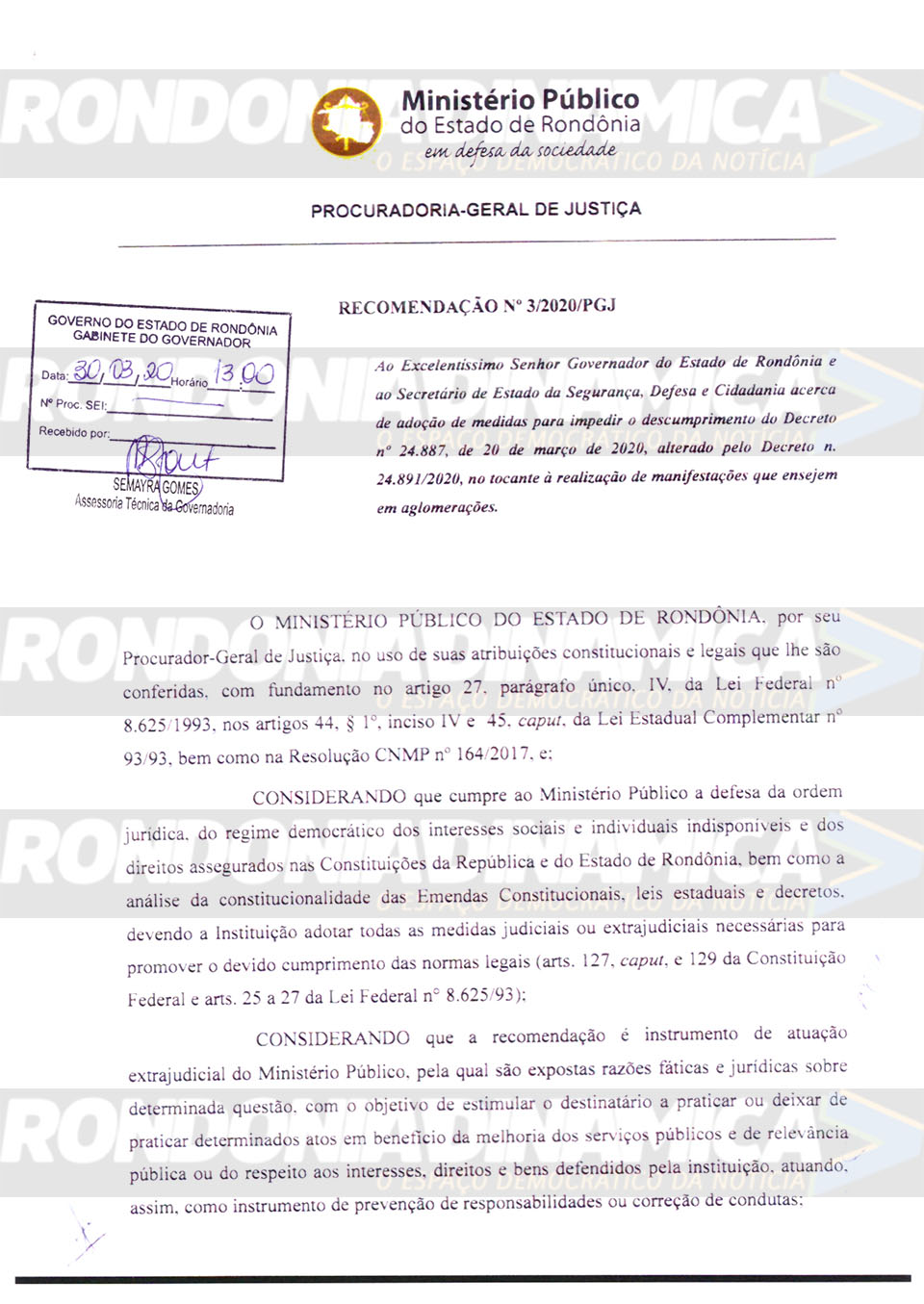 Porto Velho, RO — O Ministério Público do Estado (MP/RO) expediu recomendação endereçada ao governador Marcos Rocha, do PSL, encaminhada também para o titular da Secretaria de Estado da Segurança, Defesa e Cidadania (Sesdec/RO) José Hélio Cysneiros Pachá, conhecido como coronel Pachá.