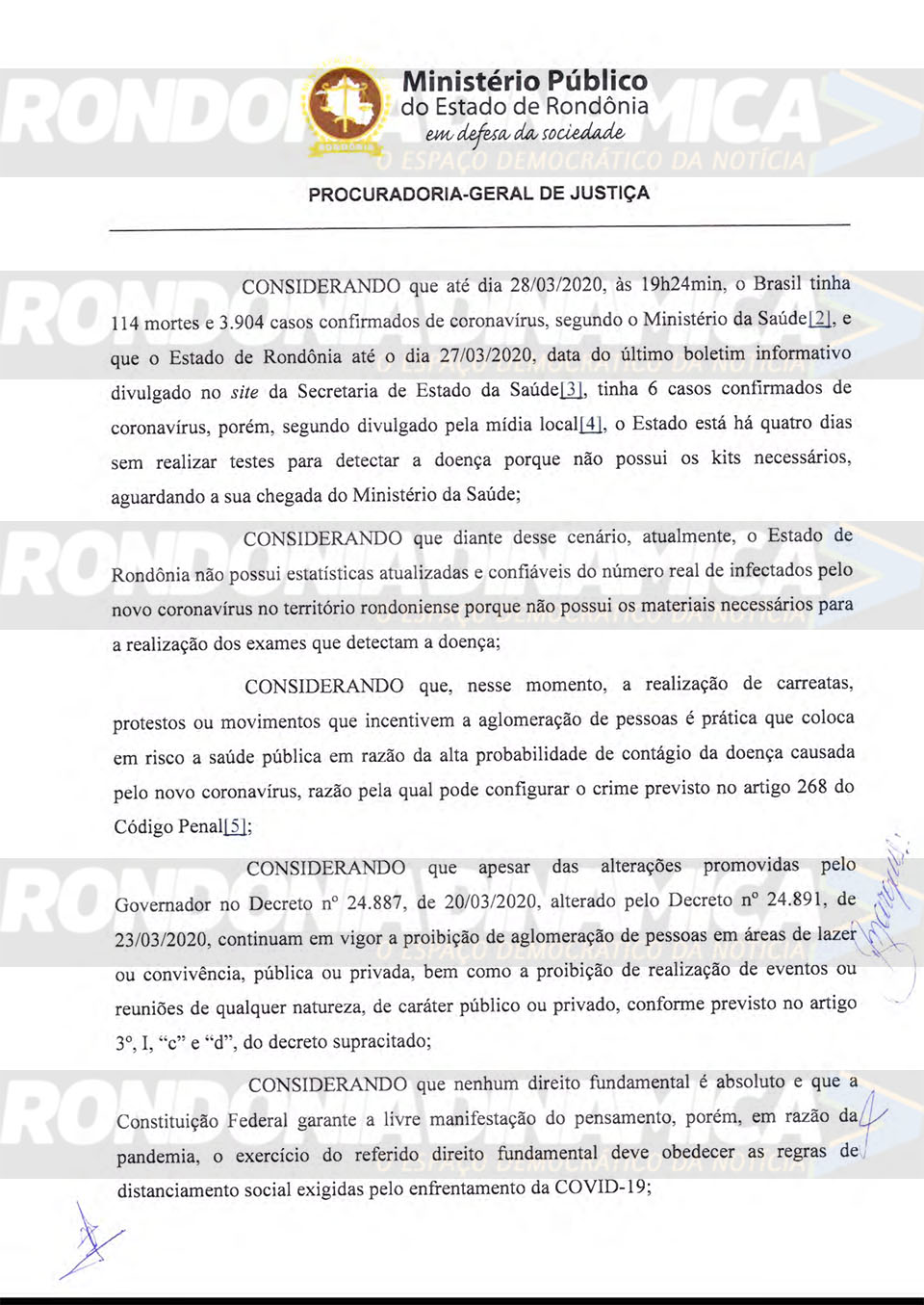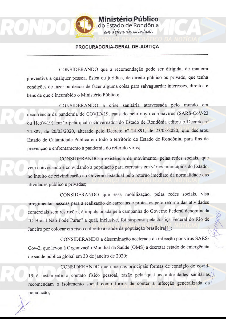 No expediente, o MP/RO solicita que o Estado utilize as forças da Polícia Militar (PM/RO), Civil (PC/RO) Bombeiros sejam usados a fim de evitar e dispesar carreatas e/ou eventuais aglomerações.