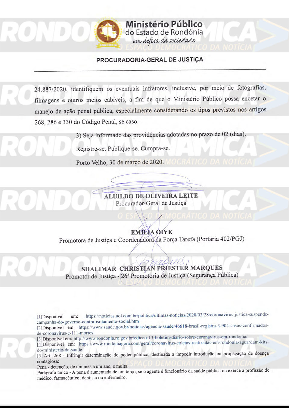 O documento é assinado pelo procurador-geral de Justiça Aluildo de Oliveira Leite em parceria com os promotores Emília Oiye, da Promotoria de Justiça e Coordenadoria da Força Tarefa e Shalimar Priester, responsável pela análise no setor de Segurança Pública.