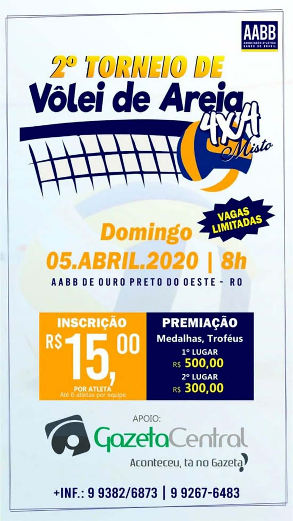Será realizado no dia 05 de abril (domingo) o 2° Torneio de Vôlei de Areia 4x4 Misto. O evento esportivo será realizado a partir das 08h na Associação Atlética Banco do Brasil – AABB – de Ouro Preto do Oeste.