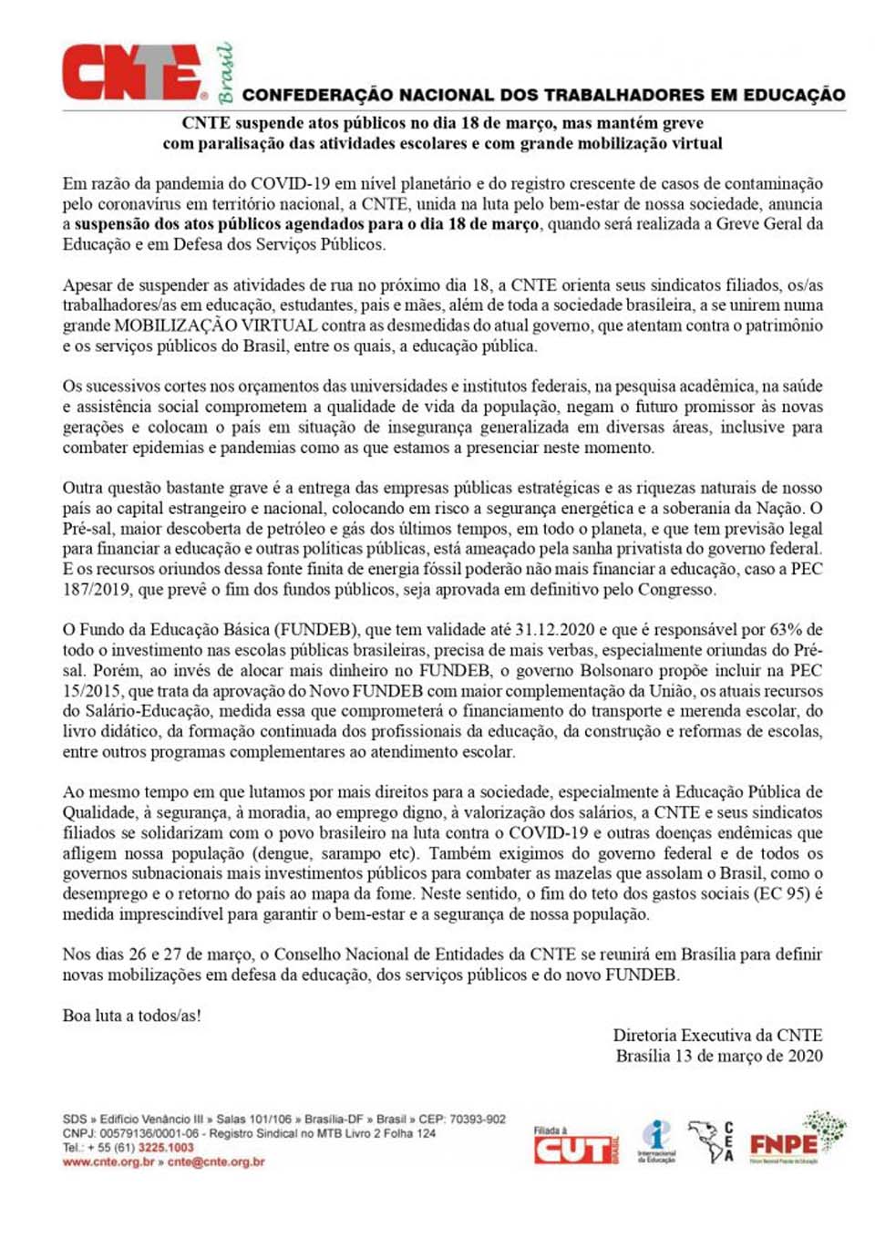 A Confederação Nacional dos Trabalhadores em Educação (CNTE) anunciou nesta sexta-feira (13/03) que os atos públicos da Greve Geral da Educação Pública, que aconteceria no dia 18/03 estão suspensos. A decisão foi tomada por conta do grande avanço de contaminação do Coronavírus (Covid-19) em todo o país.
