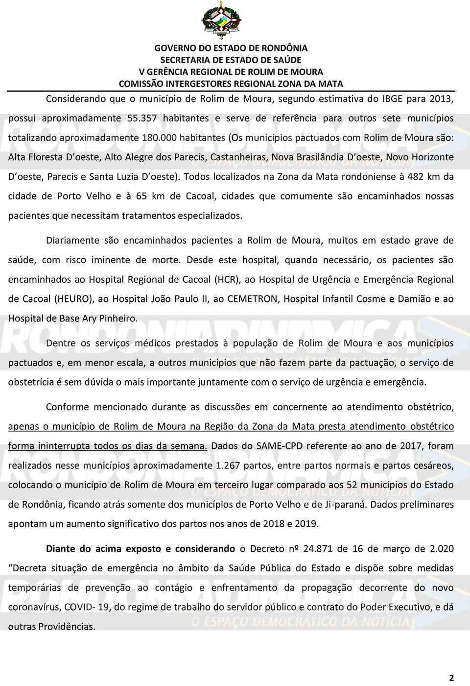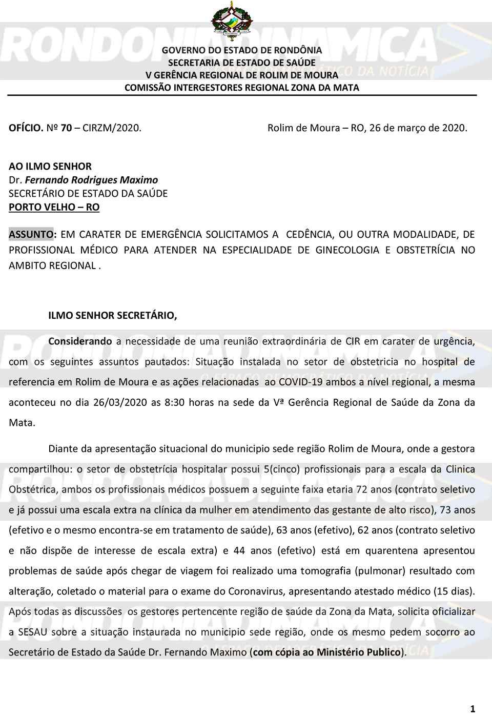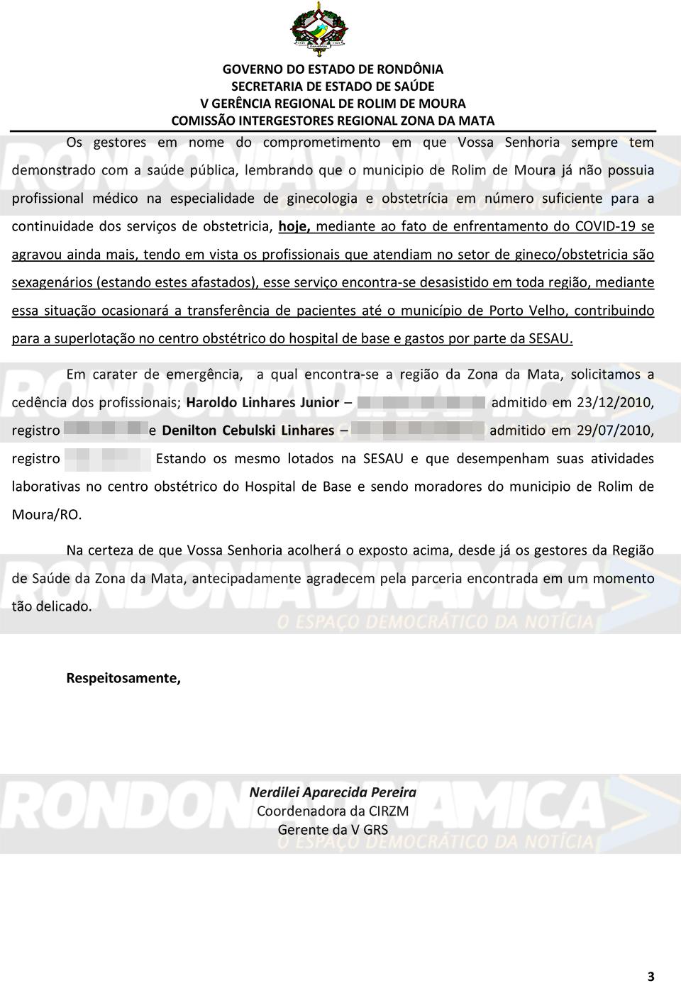 O Rondônia Dinâmica teve acesso a Ofício encaminhado por Nerdilei Aparecida Pereira, coordenadora da Comissão Intergestores Regional Zona da Mata e mandatária da V Gerência Regional de Rolim de Moura, ao secretário de Sáude Fernando Máximo.