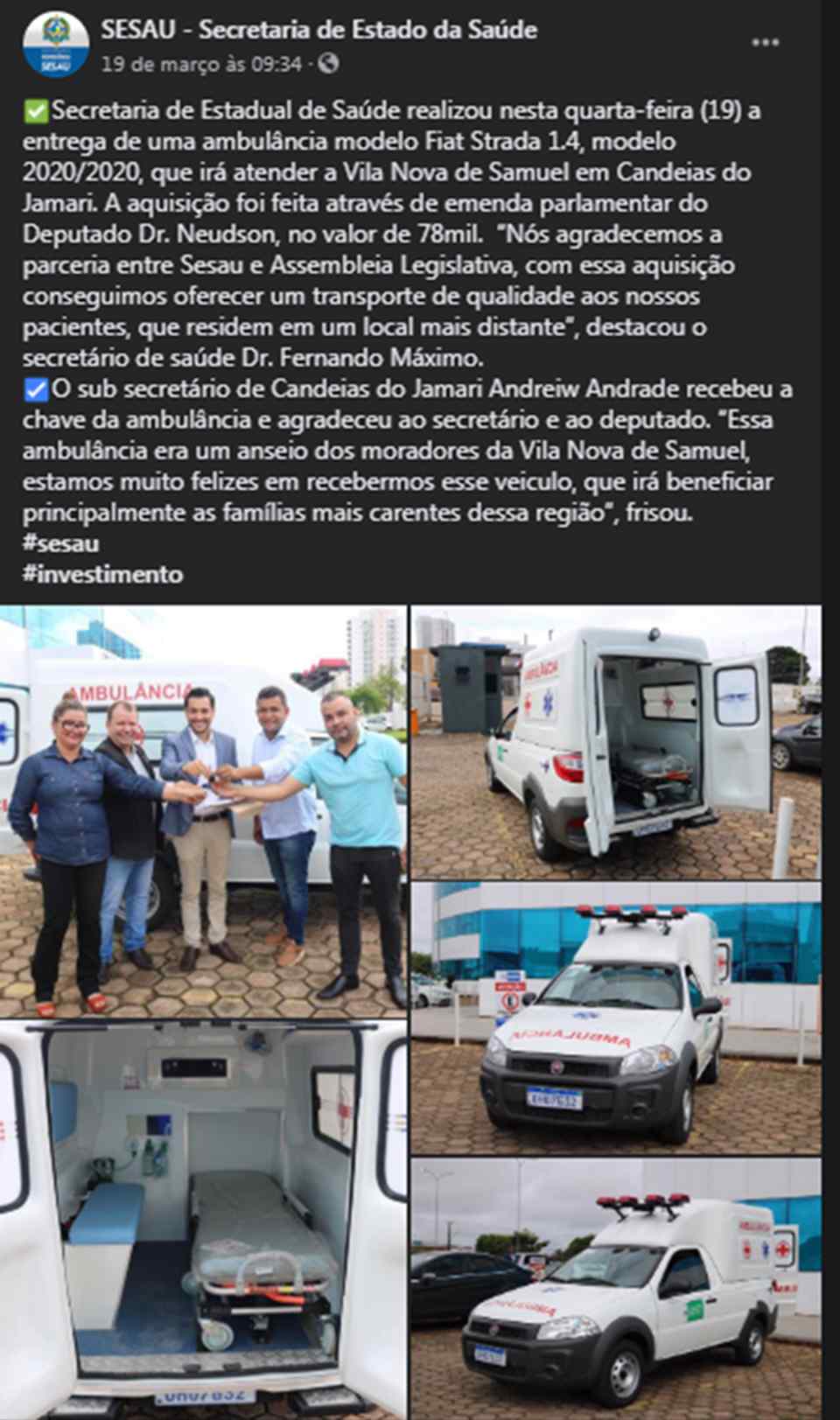 No dia 19 de março, às 09h34, ele e outro médico, o deputado Neidson de Barros Soares, conhecido como Dr. Neidson (PMN), surgiram em foto política nas dependências do Palácio Rio Madeira segurando a chave de uma ambulância junto com outras três pessoas. Quebra total dos protocolos concebidos pela Organização Mundial de Saúde (OMS) para lidar com o Coronavírus, provando que é possível, sim, capitalizar em cima tudo: até mesmo uma tragédia humanitária de escala global.