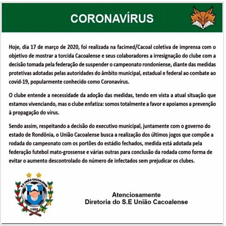 A diretoria do União Cacoalense realizou coletiva de imprensa se posicionando contra a paralisação do Campeonato Rondoniense 2020. A decisão foi tomada pela FFER (Federação de Futebol do Estado de Rondônia) em virtude da pandemia de Coronavírus.