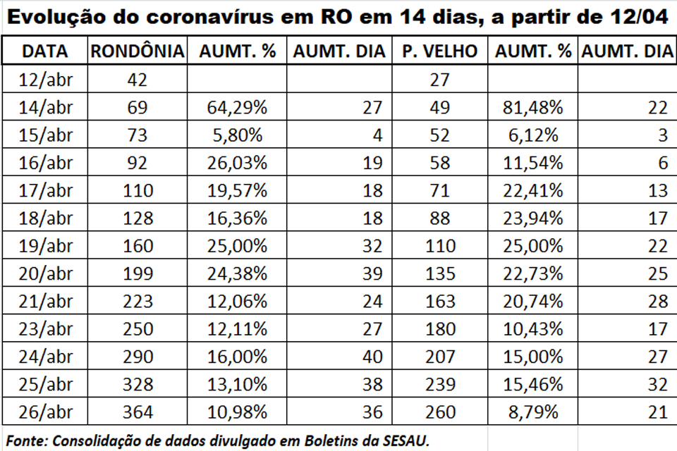 Em Rondônia, ao contrário de 14 dias seguidos de queda de novos casos, houve aumento da contaminação: no Estado cresceu de 42 casos confirmados em 12/04 para 364 infectados em 26/04, ou seja, 322 novos casos em duas semanas ou 766,67% de aumento; enquanto que em Porto Velho a situação é ainda pior, pois cresceu de 27 casos no dia 12 de abril último para 260 contaminados em 26/04, 233 novos infectados ou 862,96% de aumento, tabela anexa.