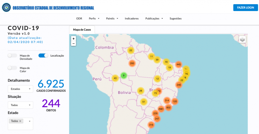 Uma visão geral e em tempo real sobre a propagação do coronavírus no Brasil está disponível ao acesso da população, por meio do portal do Observatório Estadual de Desenvolvimento Regional (ODR), instalado na Secretaria de Estado do Planejamento, Orçamento e Gestão ( Sepog). O painel sobre a doença foi lançado nesta quarta-feira (01) e conta com os trabalhos de monitoramento e atualização, durante todo o dia, de técnicos de informática e da Gerência do Observatório Estadual (GOB).