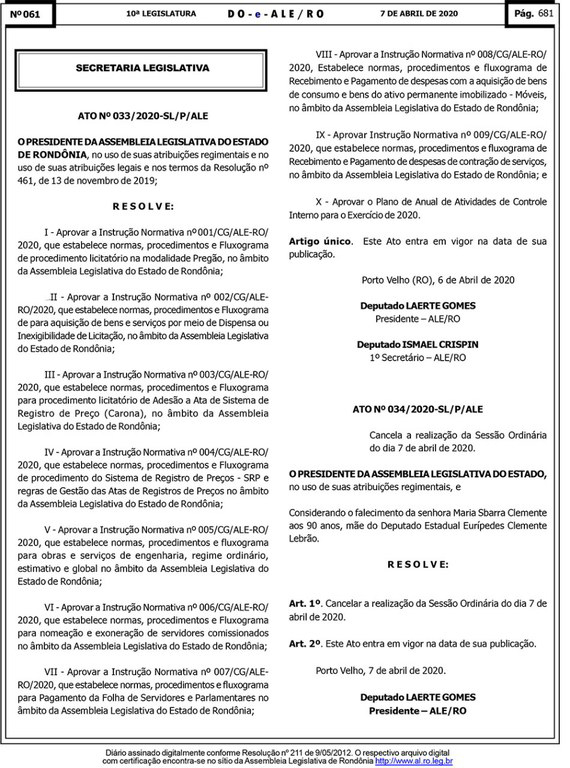 O presidente da Assembleia Legislativa de Rondônia, deputado Laerte Gomes (PSDB), assinou o Ato nº 033/2020, referente ao fluxograma dos processos administrativo da Casa de Leis. Após 36 anos de implantação do Poder Legislativo no Estado de Rondônia, essa é a primeira vez que uma ferramenta que contribuirá na gestão e no controle dos processos administrativos da Assembleia é criada.