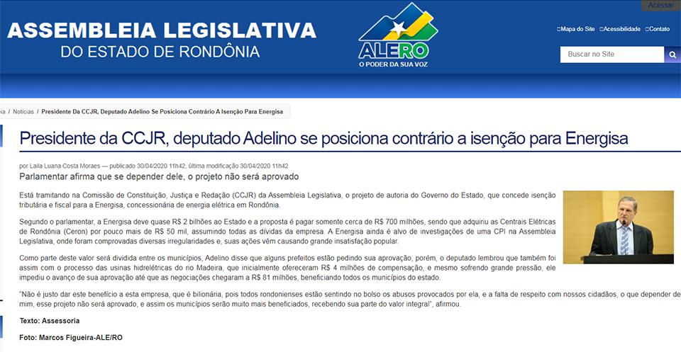 Ele já deixou claro que está tramitando na Comissão em questão "o projeto de autoria do Governo do Estado, que concede isenção tributária e fiscal para a Energisa, concessionária de energia elétrica em Rondônia".