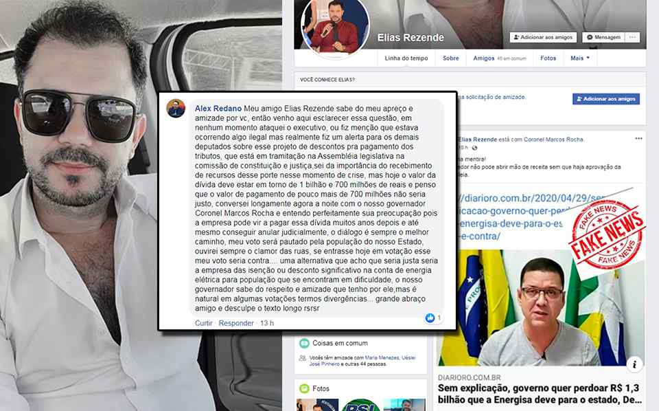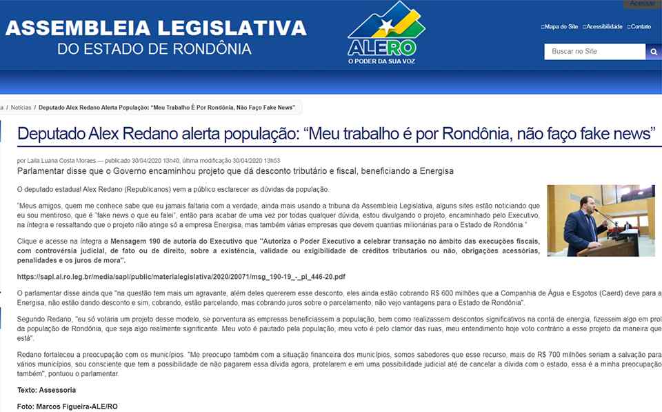 " “Meus amigos, quem me conhece sabe que eu jamais faltaria com a verdade, ainda mais usando a tribuna da Assembleia Legislativa, alguns sites estão noticiando que eu sou mentiroso, que é “fake news o que eu falei”, então para acabar de uma vez por todas qualquer dúvida, estou divulgando o projeto, encaminhado pelo Executivo, na íntegra e ressaltando que o projeto não atinge só a empresa Energisa, mas também várias empresas que devem quantias milionárias para o Estado de Rondônia".