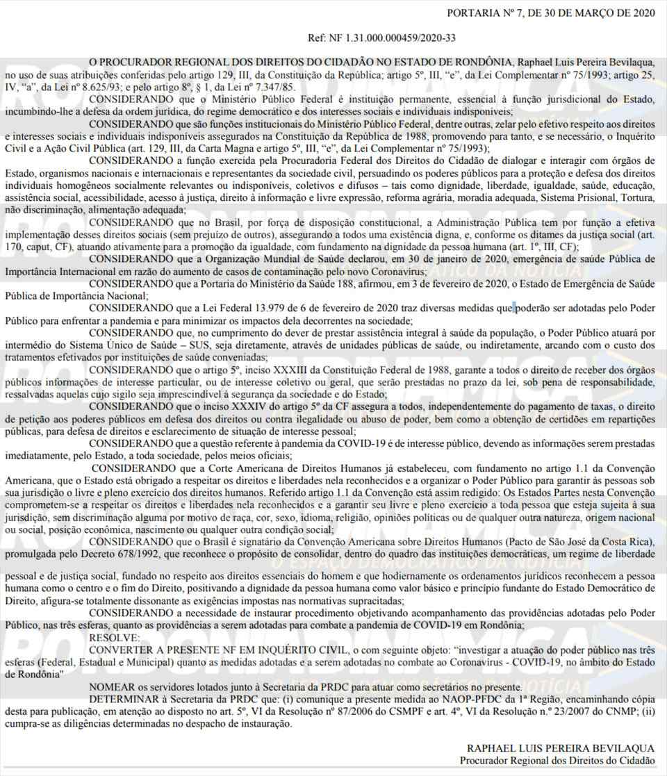 Porto Velho, RO — O procurador da República Raphael Luis Pereira Bevilaqua, responsável pelo departamento dos Direitos do Cidadão no Ministério Público Federal (MPF/RO), deflagrou inquérito civil a fim de " “investigar a atuação do poder público nas três esferas (Federal, Estadual e Municipal) quanto as medidas adotadas e a serem adotadas no combate ao Coronavírus - COVID-19, no âmbito do Estado de Rondônia".