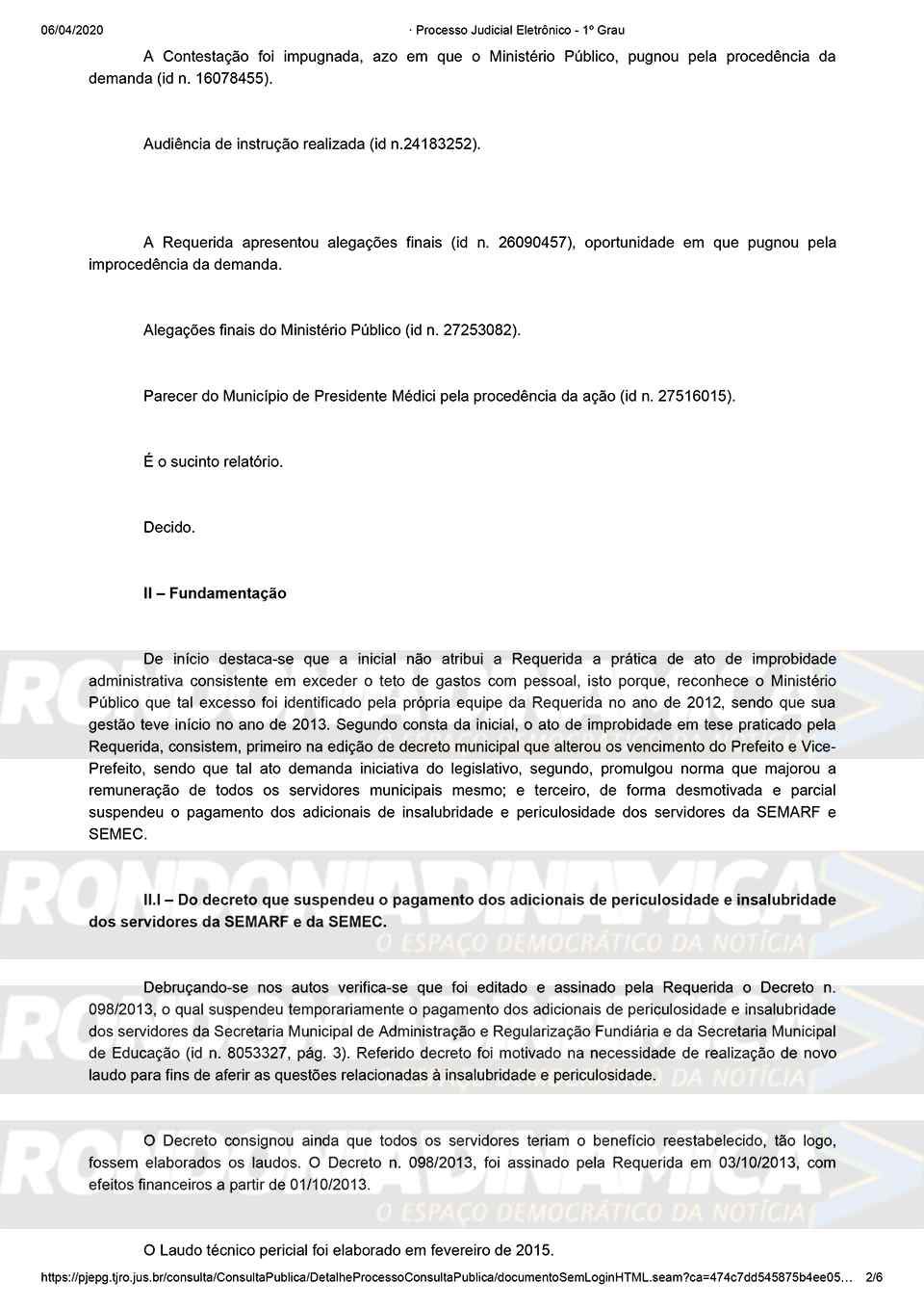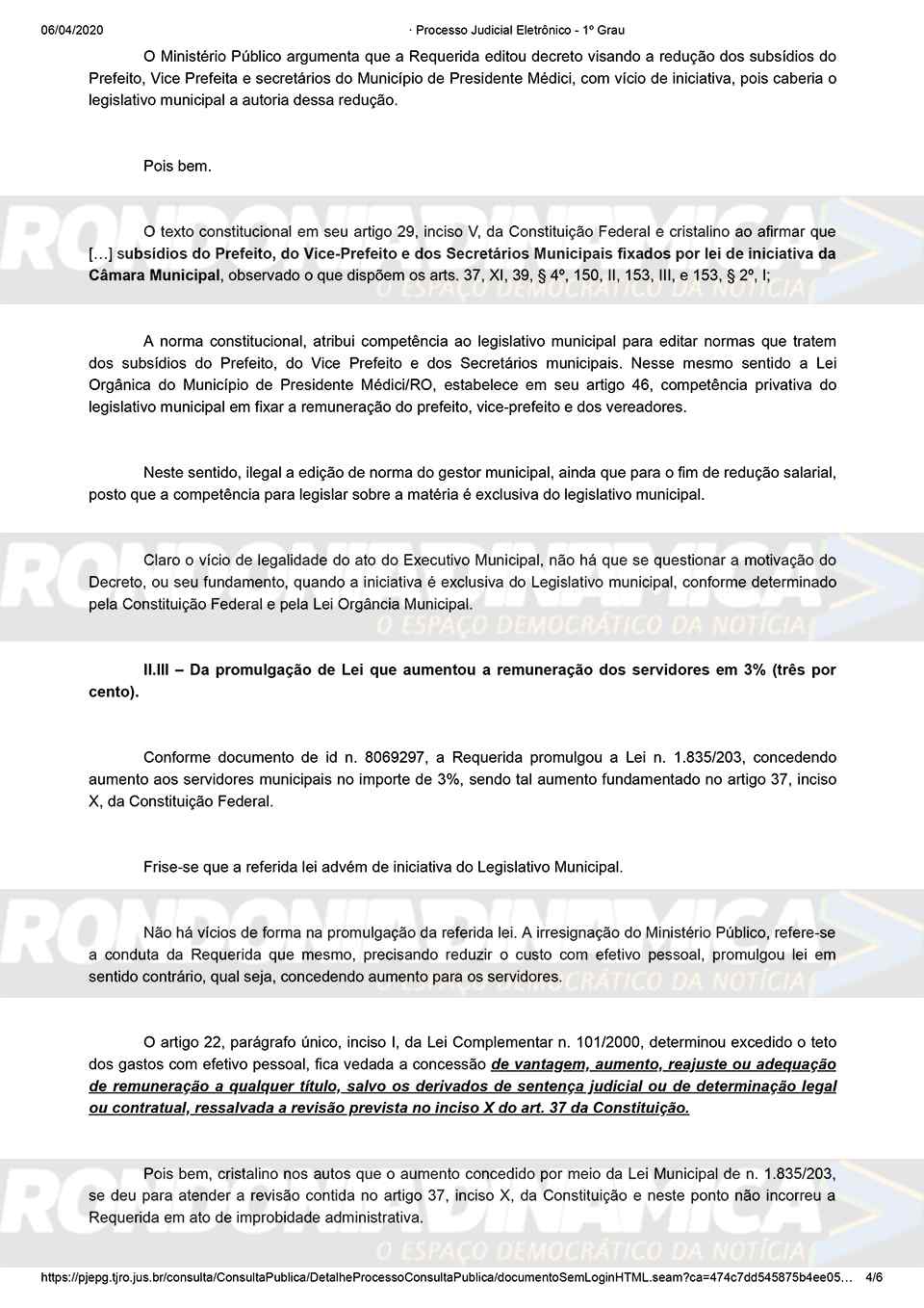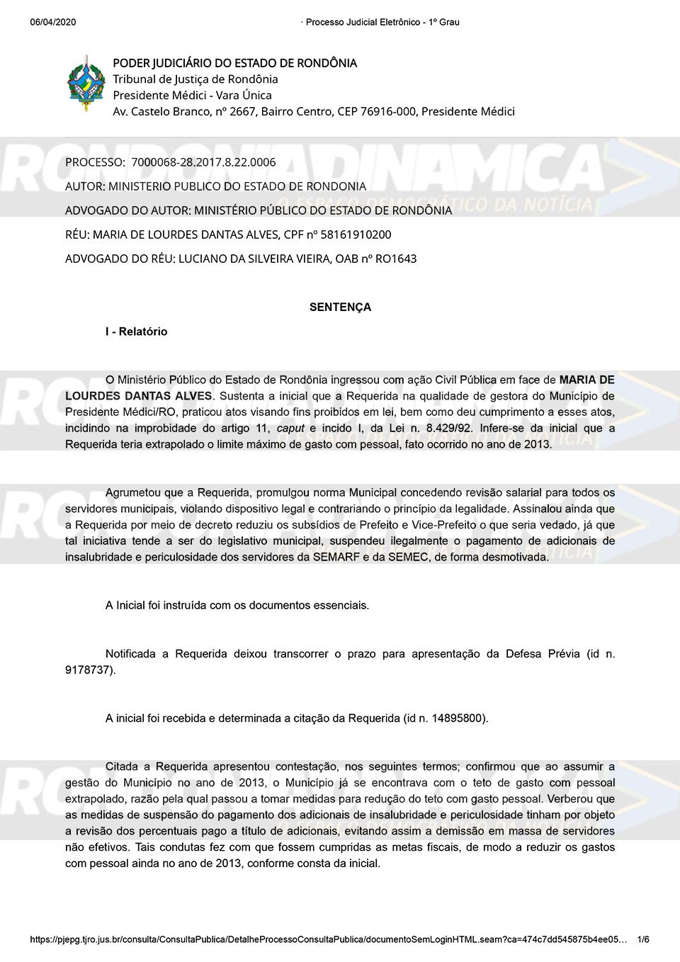"O Ministério Público do Estado de Rondônia ingressou com ação Civil Pública em face de MARIA DE LOURDES DANTAS ALVES. Sustenta a inicial que a Requerida na qualidade de gestora do Município de Presidente Médici/RO, praticou atos visando fins proibidos em lei, bem como deu cumprimento a esses atos, incidindo na improbidade do artigo 11, caput e incido I, da Lei n. 8.429/92. Infere-se da inicial que a Requerida teria extrapolado o limite máximo de gasto com pessoal, fato ocorrido no ano de 2013.
