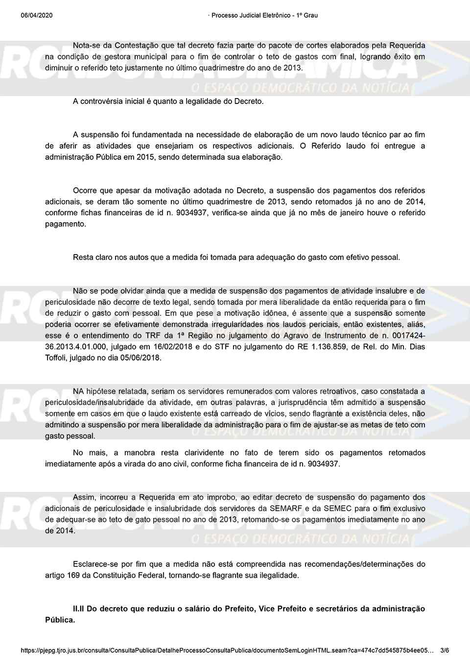 Agrumetou que a Requerida, promulgou norma Municipal concedendo revisão salarial para todos os servidores municipais, violando dispositivo legal e contrariando o princípio da legalidade. Assinalou ainda que a Requerida por meio de decreto reduziu os subsídios de Prefeito e Vice-Prefeito o que seria vedado, já que tal iniciativa tende a ser do legislativo municipal, suspendeu ilegalmente o pagamento de adicionais de insalubridade e periculosidade dos servidores da SEMARF e da SEMEC, de forma desmotivada".