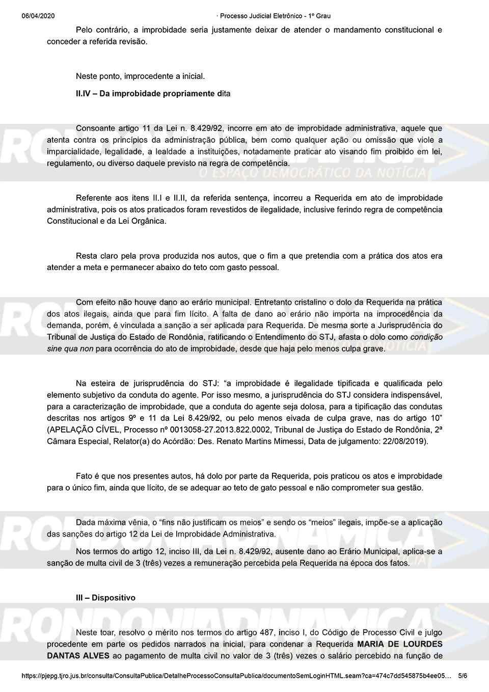 "Com efeito não houve dano ao erário municipal. Entretanto cristalino o dolo da Requerida na prática dos atos ilegais, ainda que para fim lícito. A falta de dano ao erário não importa na improcedência da demanda, porém, é vinculada a sanção a ser aplicada para Requerida. De mesma sorte a Jurisprudência do Tribunal de Justiça do Estado de Rondônia, ratificando o Entendimento do STJ, afasta o dolo como condição sine qua non para ocorrência do ato de improbidade, desde que haja pelo menos culpa grave".