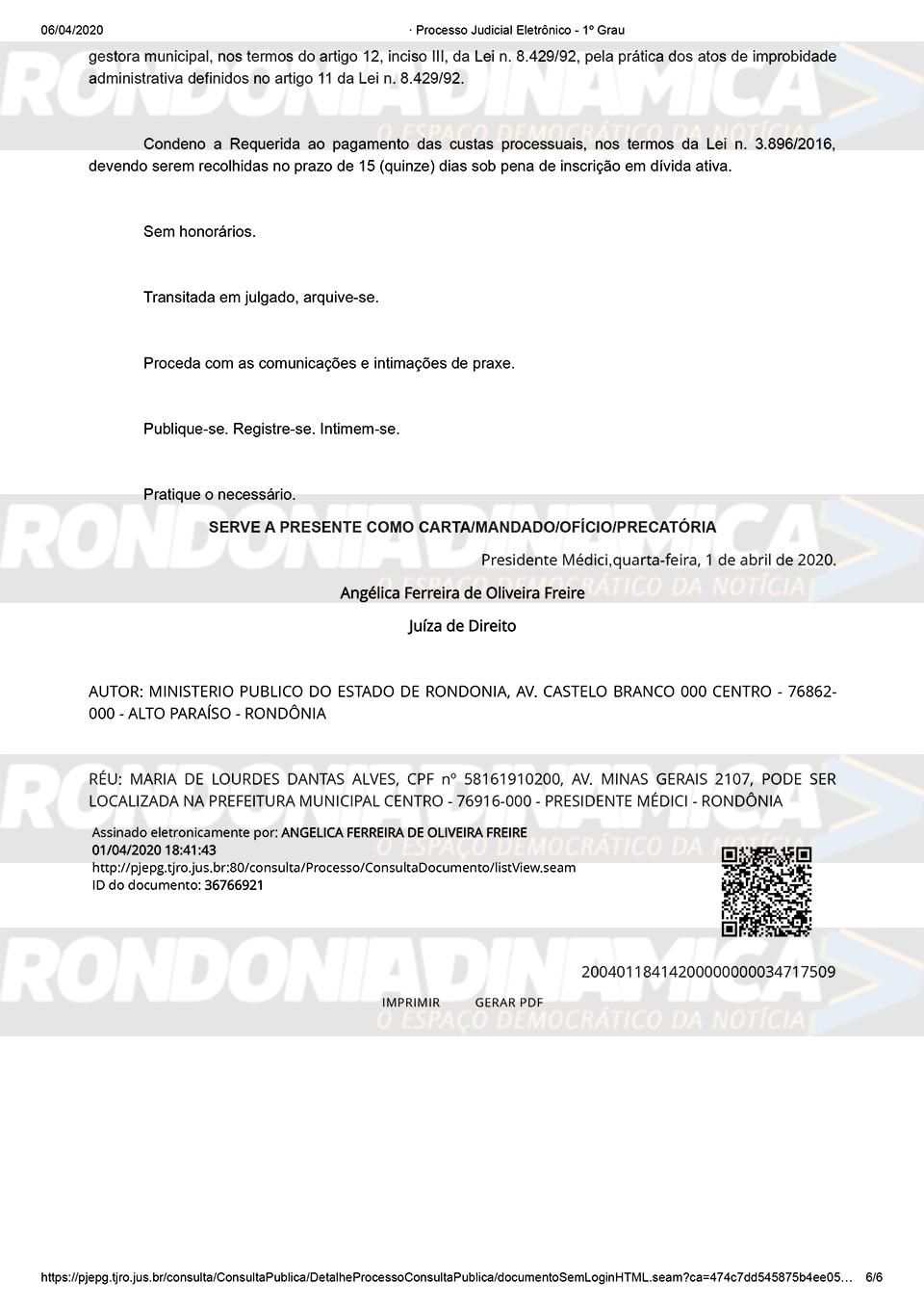 Porto Velho, RO — A juíza de Direito Angélica Ferreira de Oliveira Freire, da Vara Única de Presidente Médici, condenou a ex-prefeita daquele município, Maria de Lourdes Dantas Alves, a Lourdinha, do PT, pela prática de improbidade administrativa.