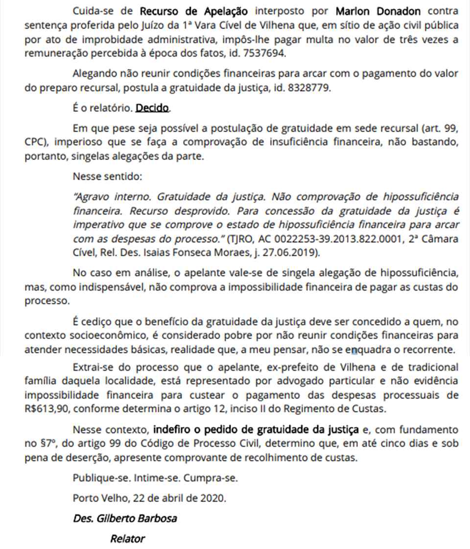 "Extrai-se do processo que o apelante, ex-prefeito de Vilhena e de tradicional família daquela localidade, está representado por advogado particular e não evidência impossibilidade financeira para custear o pagamento das despesas processuais de R$613,90, conforme determina o artigo 12, inciso II do Regimento de Custas".