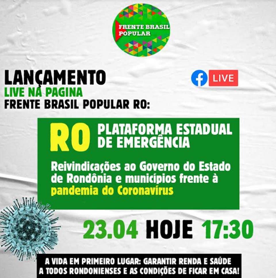 A Frente Brasil Popular Rondônia lança nesta quinta-feira (23/04), a Plataforma Estadual de Emergência, com 35 medidas que irão amenizar os impactos sociais e econômicos à população rondoniense, em especial às famílias de baixa renda, diante da atual crise sanitária causada pelo Covid-19.
