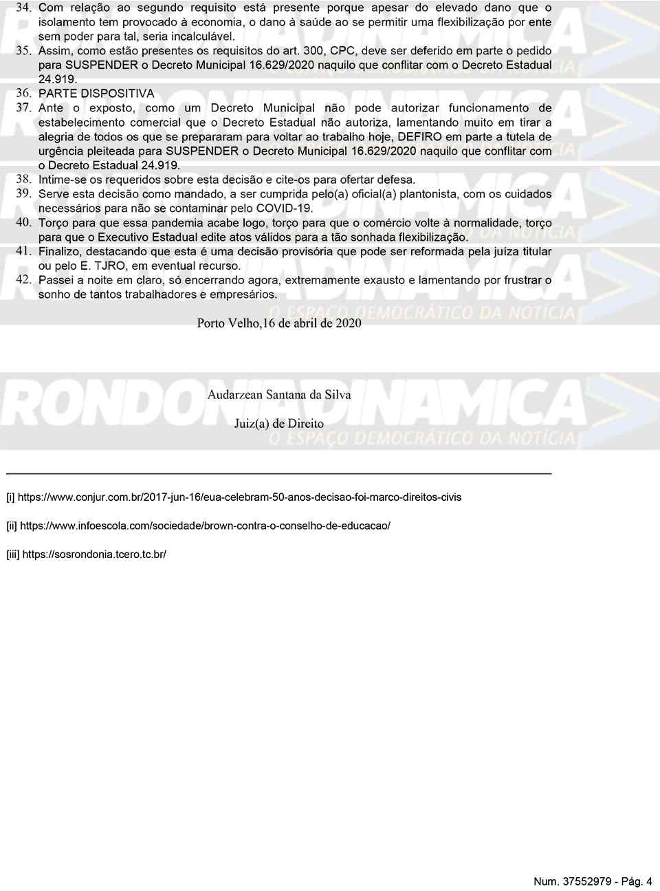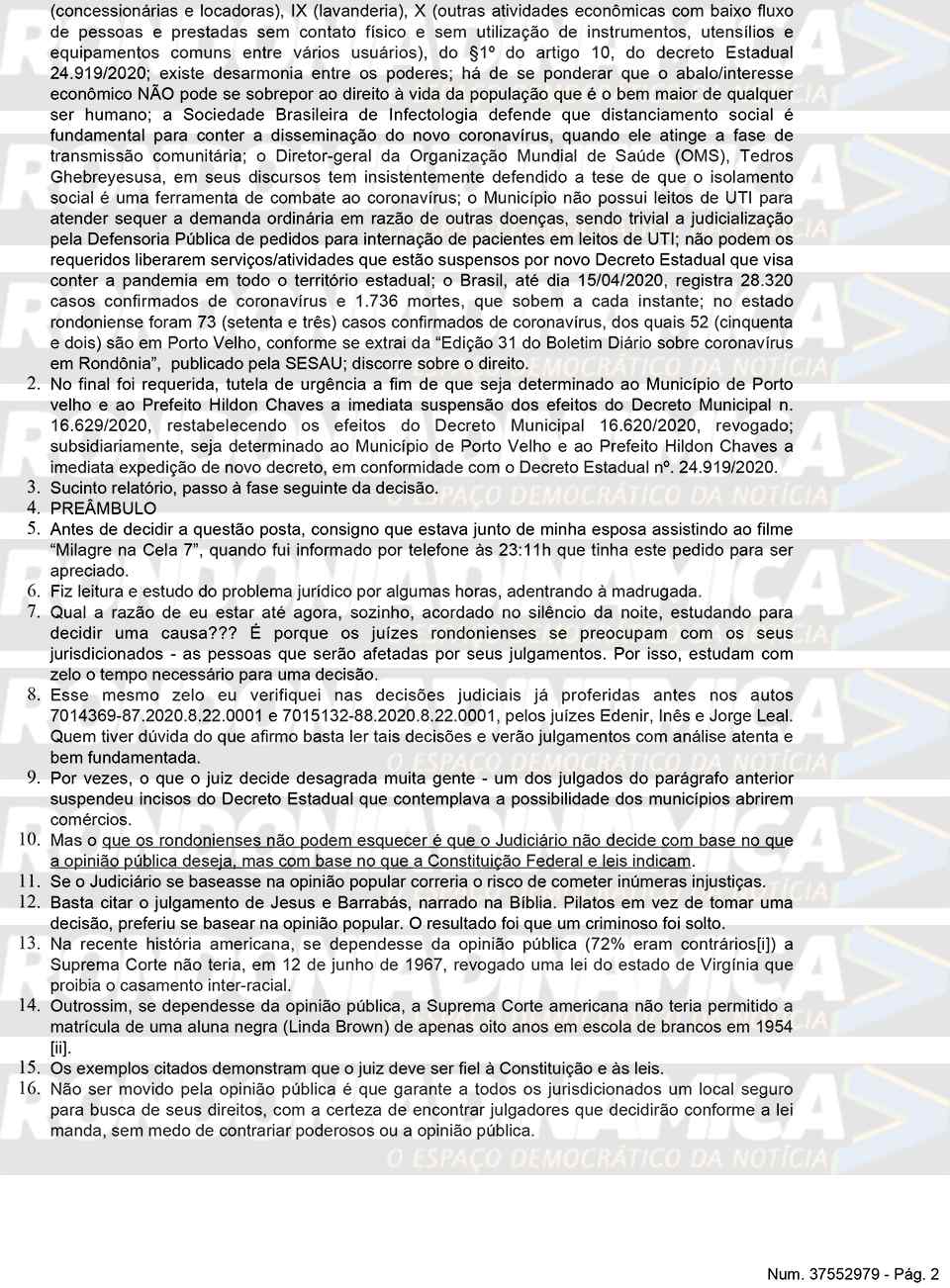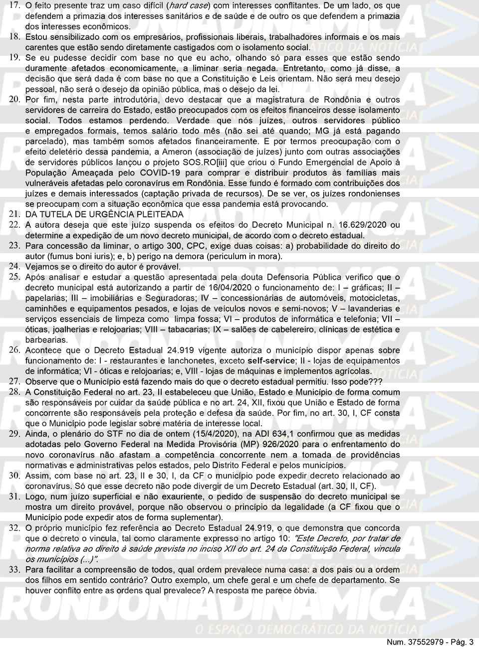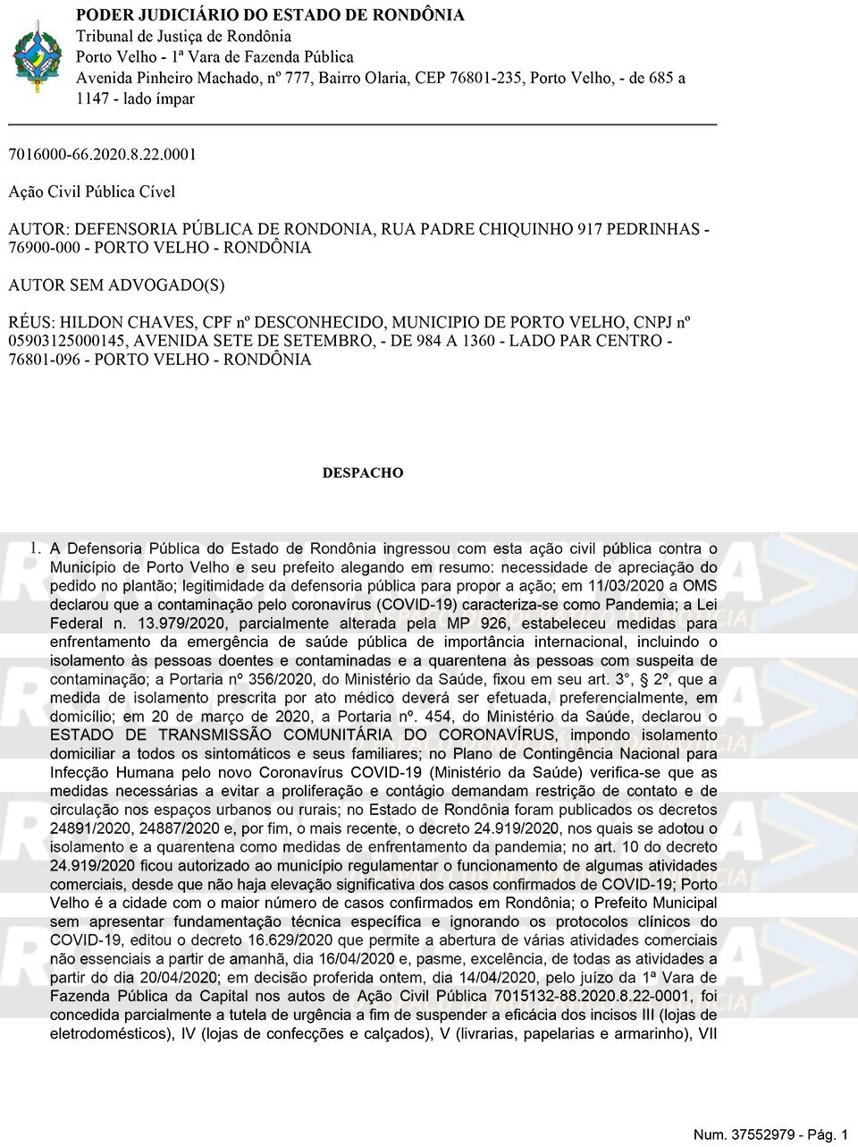 Porto Velho, RO — O juiz de Direito Audarzean Santana da Silva, da 1ª Vara de Fazenda Pública de Porto Velho, concedeu, parcialmente, liminar solicitada pela Defensoria Pública de Rondônia (DPE/RO) e determinou a suspensão de parte do novo decreto editado e publicado pelo prefeito Hildon Chaves, do PSDB, determinando que o comércio seja restringido em termos, de acordo com as exigências legais do Estado.