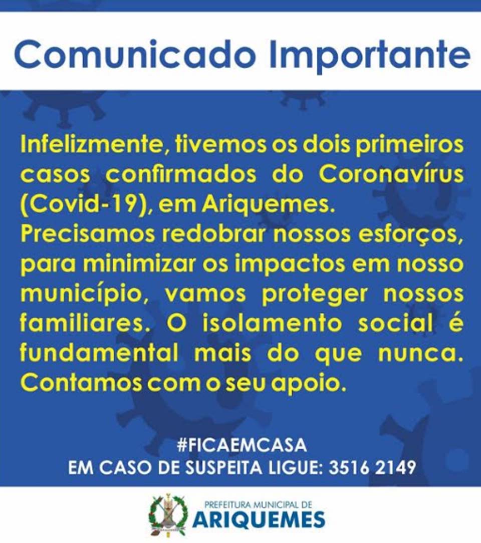 A Prefeitura de Ariquemes, através da Secretaria Municipal de Saúde (SEMSAU), confirmou nesta sexta-feira (10), os dois primeiros casos de Coronavírus (Covid-19), em pacientes do município.