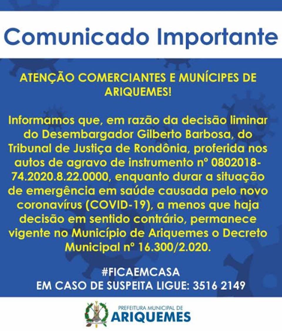 A Prefeitura de Ariquemes informa que em razão da decisão liminar do Desembargador Gilberto Barbosa, do Tribunal de Justiça de Rondônia (TJ-RO), proferida nesta sexta-feira (10), nos autos do agravo de instrumento n° 0802018-14.2020.8.22.0000, que enquanto durar a situação de emergência em saúde causada pelo novo Coronavírus (Covid-19), a menos que haja decisão em contrário, permanecerá vigente no município os efeitos do Decreto Municipal n° 16.300/2020.