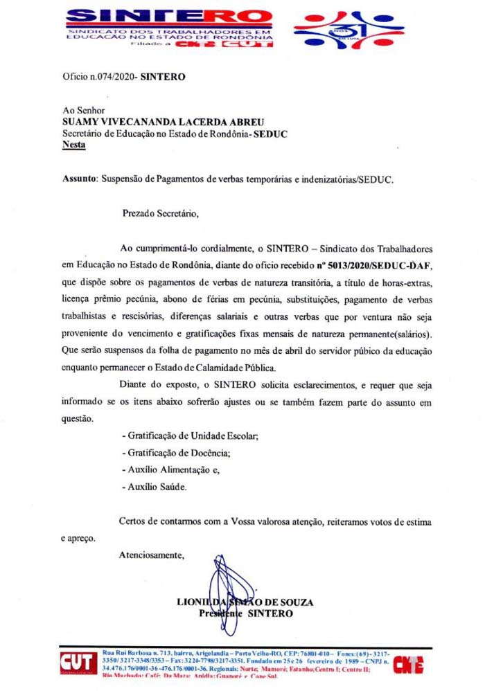 Ao tomar conhecimento da determinação da Seduc em suspender os pagamentos de verbas de natureza transitória e indenizatória, o Sintero logo tratou de providenciar um parecer interno da assessoria jurídica da entidade, verificando a base legal da medida. Imediatamente, o sindicato também elaborou um documento oficial, cobrando um detalhamento da Seduc de quais itens do contracheque dos trabalhadores em educação seriam atingidos com a determinação. Além disso, o Sintero manteve contato extraoficial com técnicos da Seduc para garantir informações necessárias sobre essa determinação.